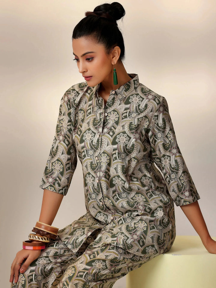 Our 2-piece green printed silk blend co-ord set features an A-line top with a mandarin collar and three-quarter sleeves. Complemented with matching trousers with a partially elasticated waistband and roomy pockets. Elevated with floral prints and stylish buttons, this style is perfect for casual outings.