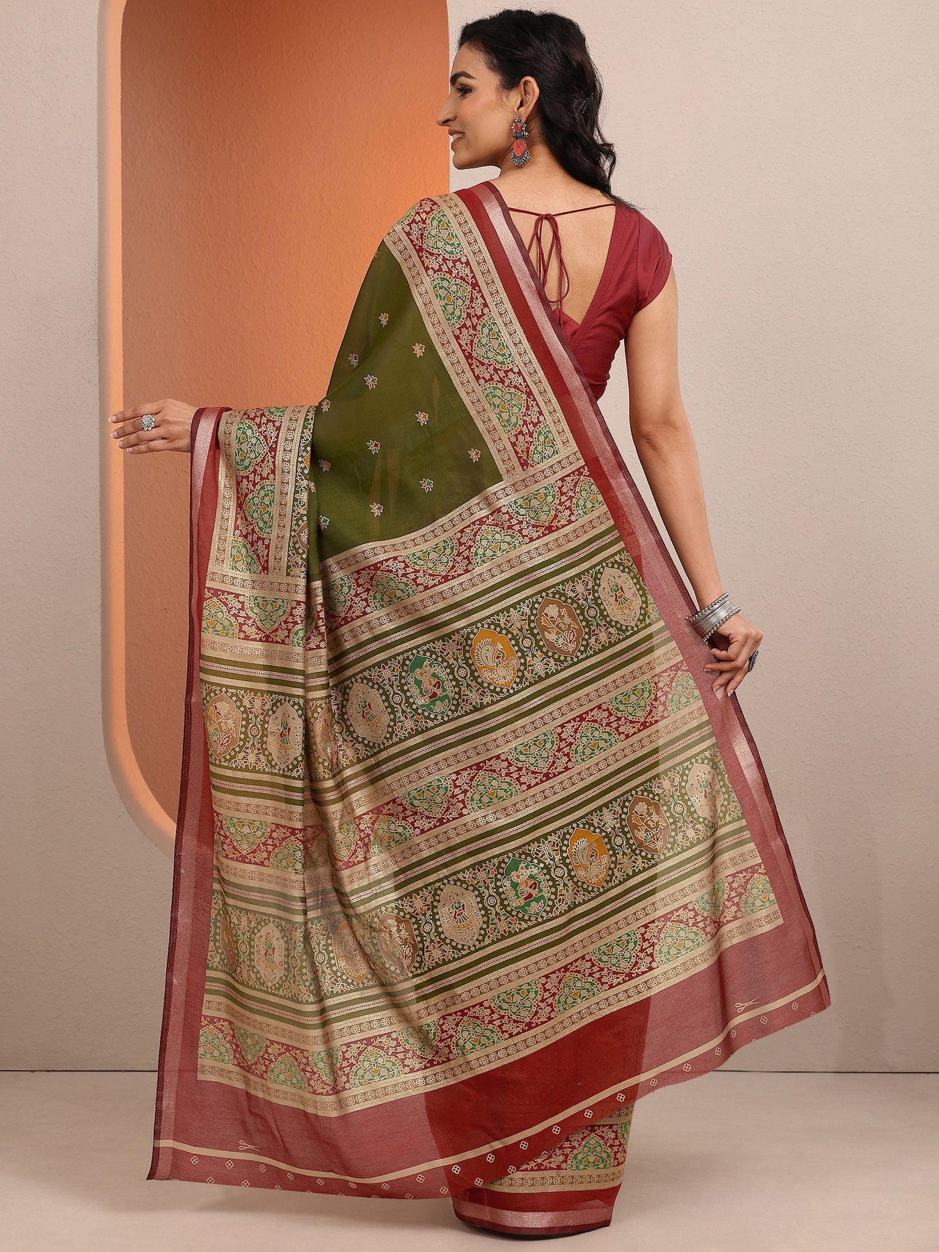 Green Printed Silk Blend Saree With Unstitched Blouse Piece