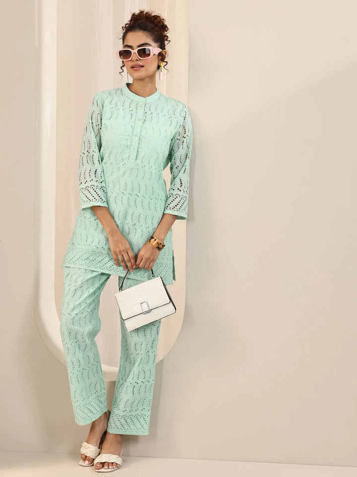 Our 2-piece Sea Green printed Cotton co-ord set features a Straight-fit Tunic with a Mandarin Collar neckline and Three-quarter sleeves. Complemented with matching Palazzos with an Elasticated waistband. Highlighted with Self Design, this style is perfect for Casual wear.
