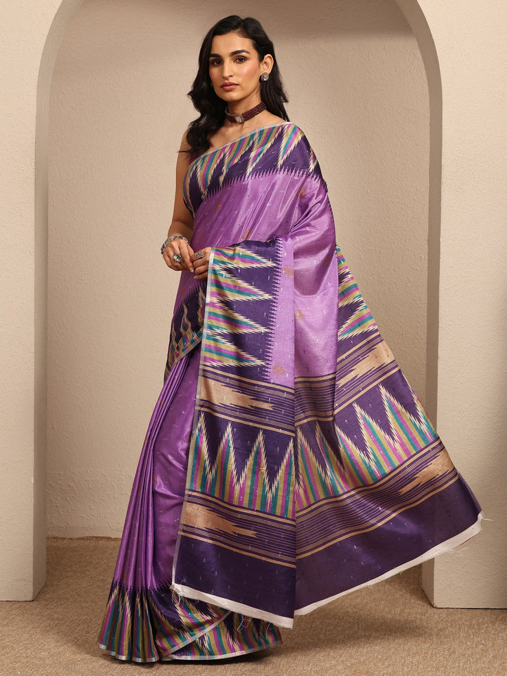 Our purple printed silk blend saree features captivating geometric print. Complemented with a blouse piece. This charming saree is perfect for festive occasions.