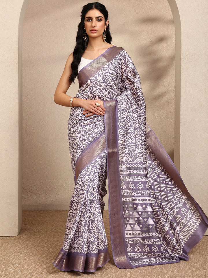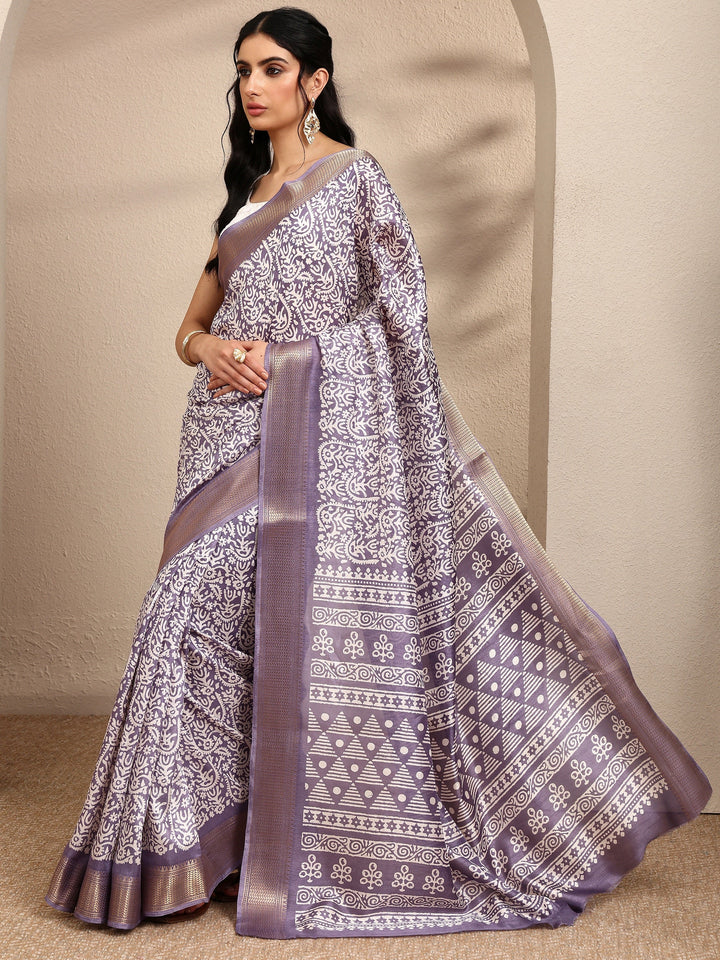 Lavender Printed Silk Blend Saree With Unstitched Blouse Piece