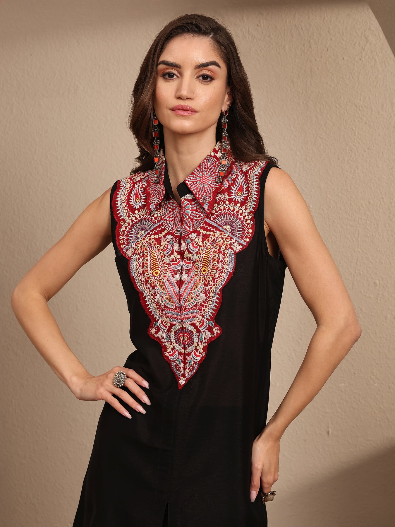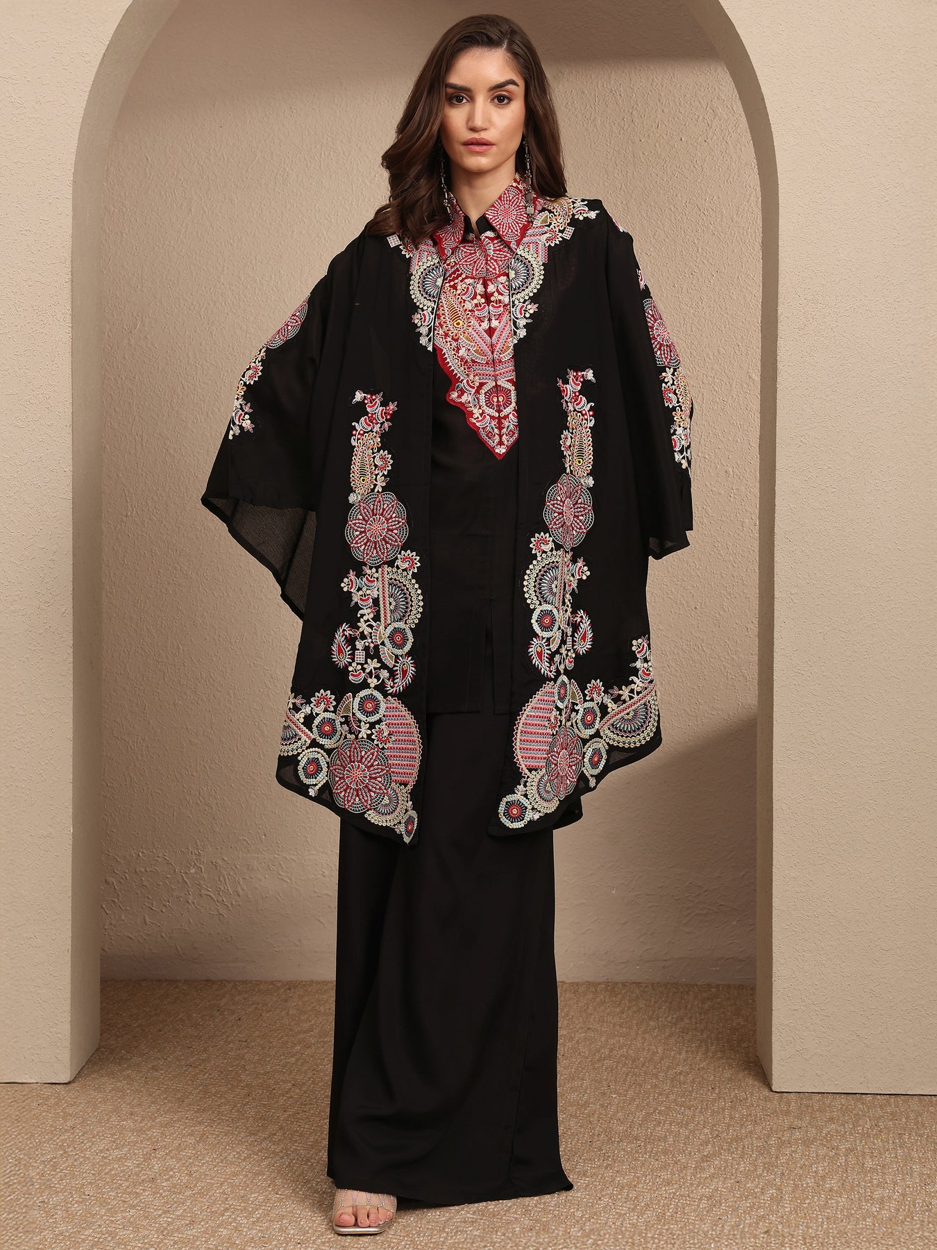 Our 2-piece black embroidered Crepe co-ord set features a Straight-fit Shirt with a Shirt Collar neckline and Long Sleeves. Complemented with matching Trousers with a Partially Elasticated waistband and 2 pockets. Highlighted with floral embroidered, this style is perfect for Dark Festive.