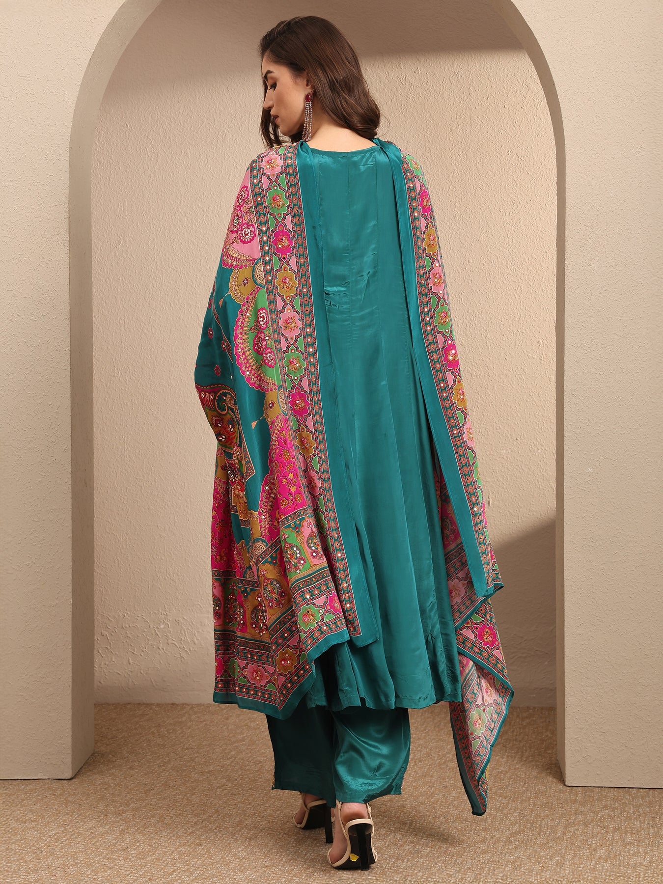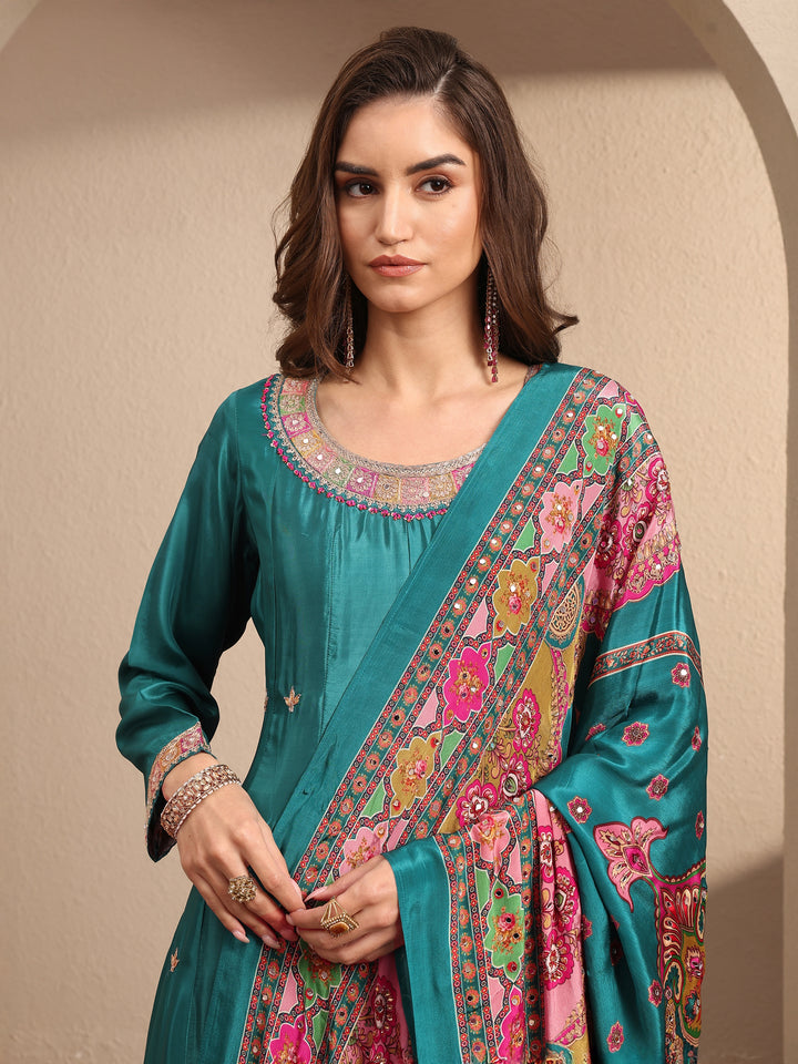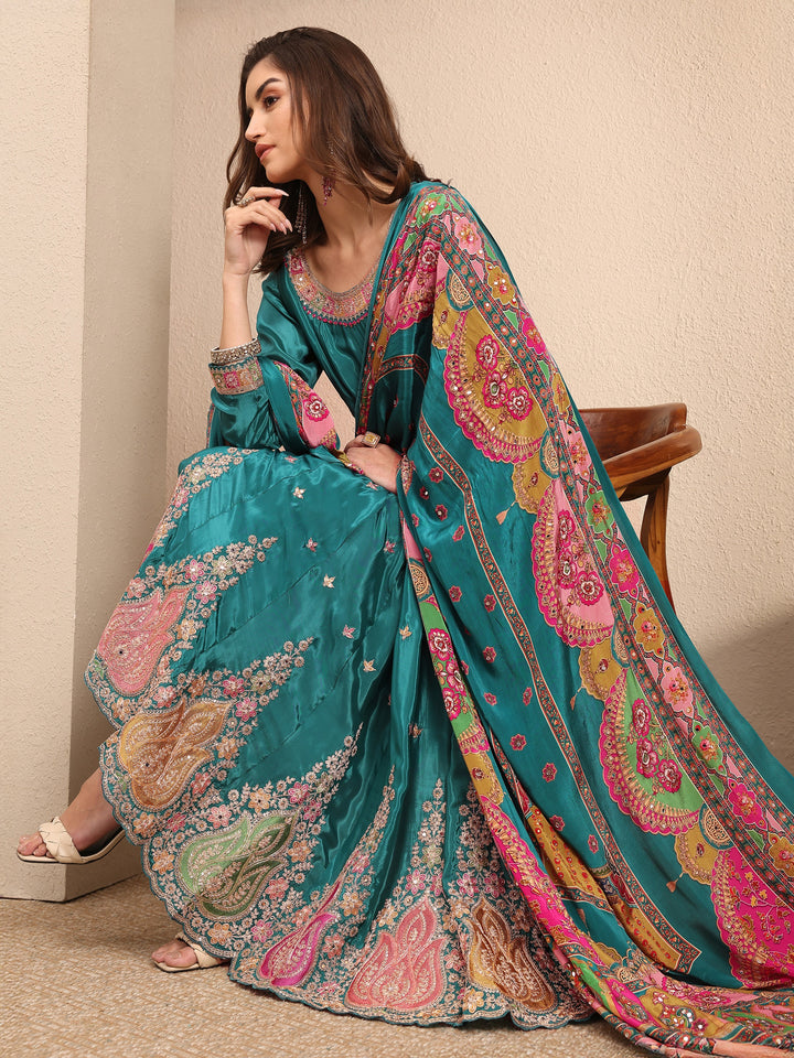 Our 3-piece Teal Crepe Anarkali Kurta Set features a Round Neckline, Comfortable Full Sleeves, and statement Yoke. Complemented with Lining and Straight Pants with a Partially Elasticated waistband and 2 pockets, and a Printed Dupatta. Adorned with embellished, this style is perfect for Dark Festive.