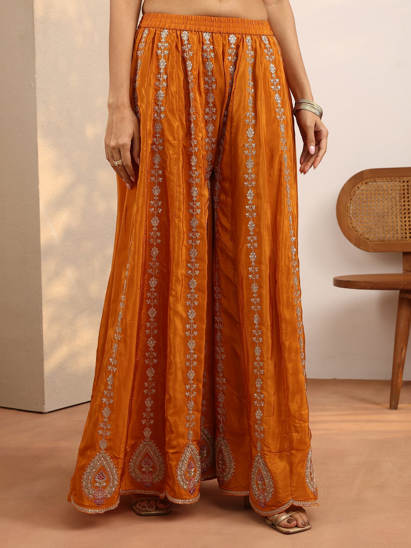 Our 3-piece orange crepe straight-fit kurta set features a round neckline, regular sleeves, and statement yoke. Complemented with flared palazzo pants with a partially elasticated waistband and a printed dupatta. Adorned with embroidered, this style is perfect for festive occasions.