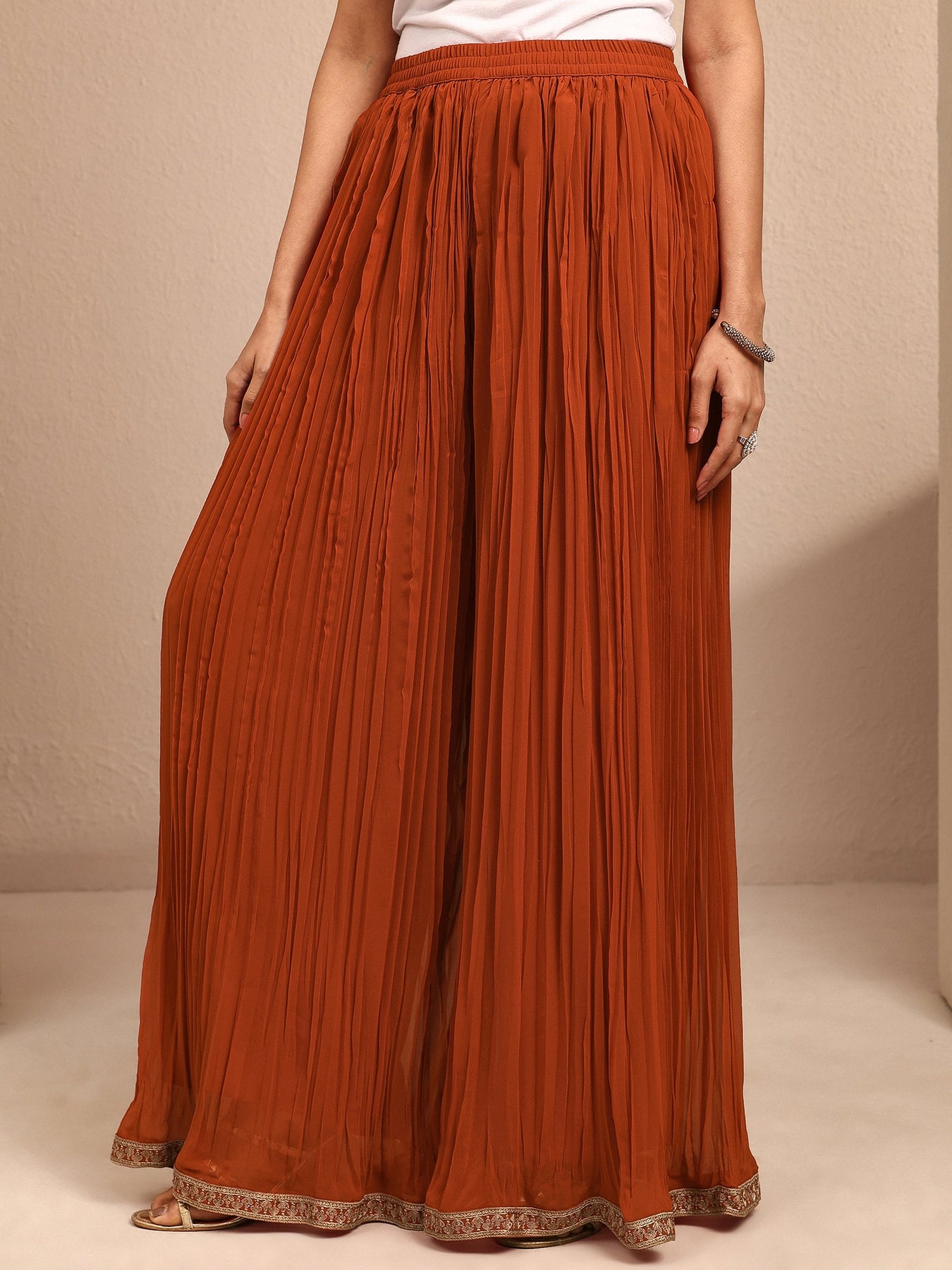 Our 3-piece rust georgette straight-fit kurta set features a V-neckline, regular sleeves, and statement yoke. Complemented with lining and palazzo pants with a partially elasticated waistband, and an embroidered dupatta. Adorned with floral embroidered, this style is perfect for dark festive occasions.