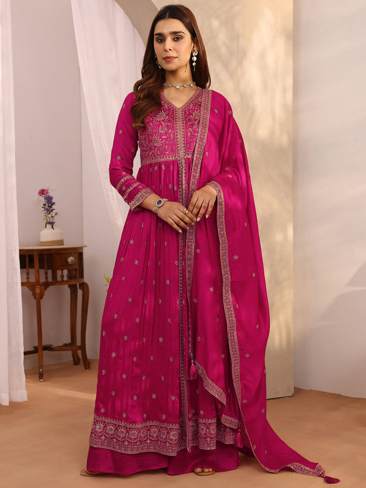 Libas Art Pink Embroidered Chinon Anarkali Suit Set With Dupatta