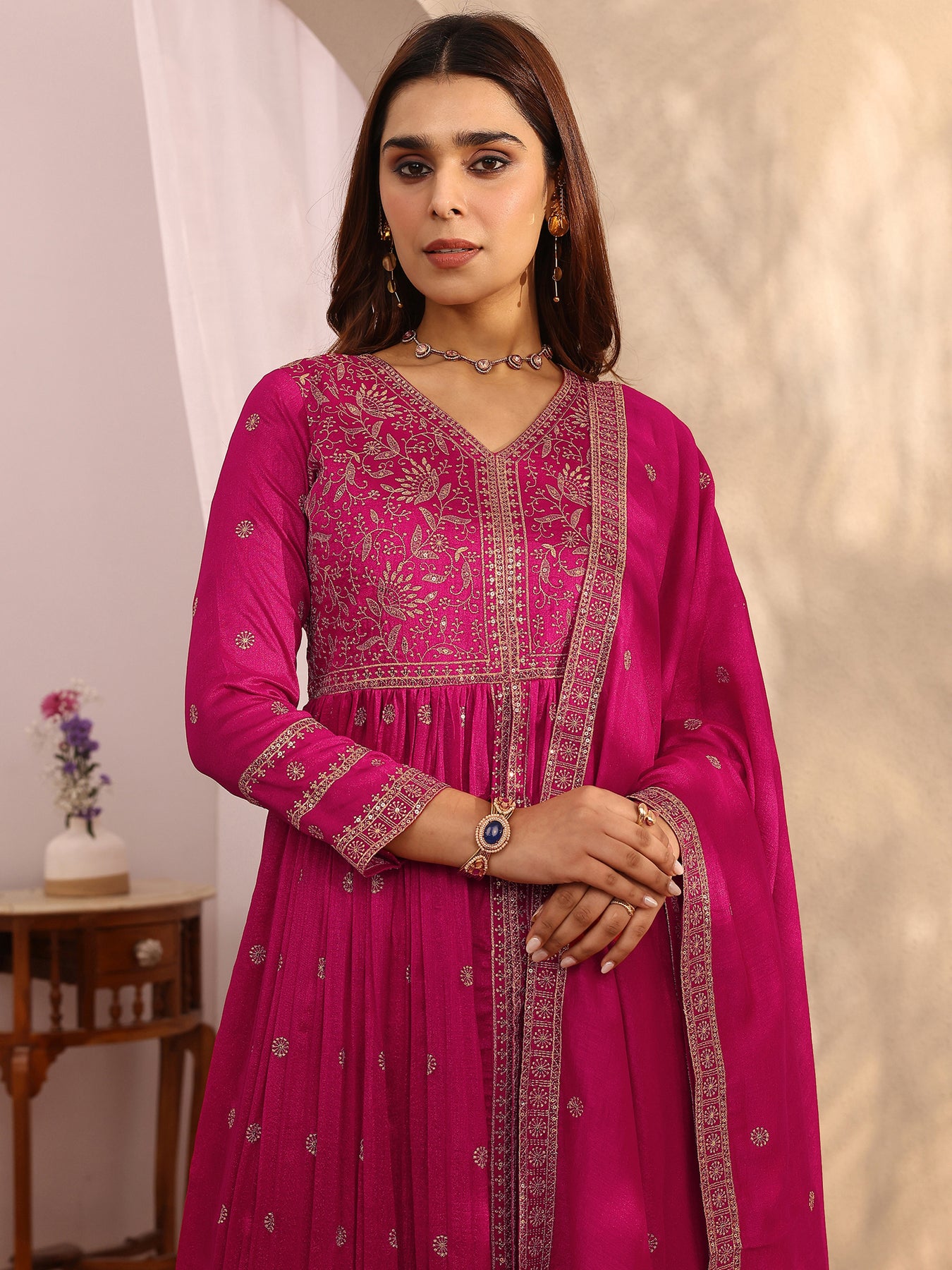 Our 3-piece pink Chinon Anarkali kurta set features a V-neckline, regular sleeves, and statement yoke. Complemented with salwar pants with a partially elasticated waistband and an embroidered dupatta. Adorned with floral embroidered, this style is perfect for festive occasions.
