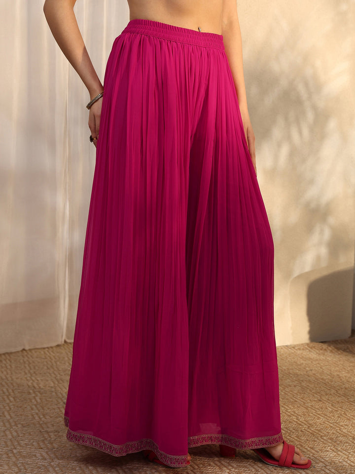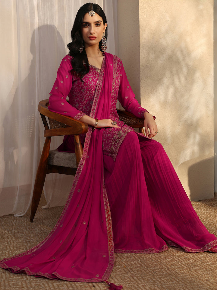 Our 3-piece pink georgette straight-fit kurta set features a V-neckline, regular sleeves, and statement yoke. Complemented with lining and sharara pants with a partially elasticated waistband, and an embroidered dupatta. Adorned with Embroidered, this style is perfect for festive occasions.
