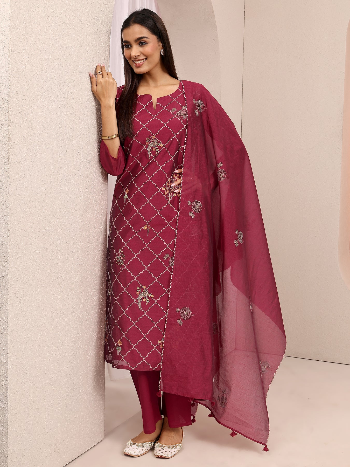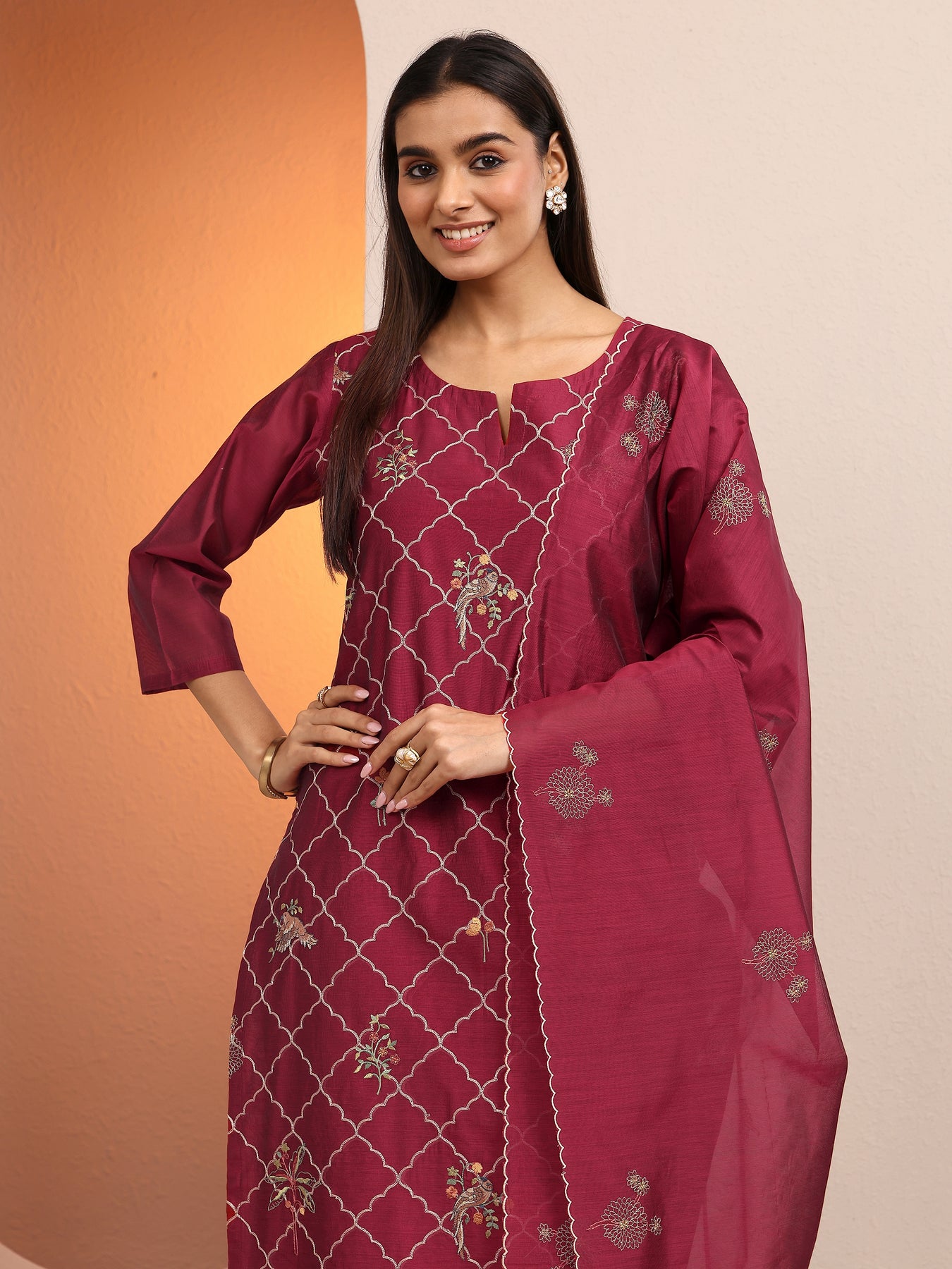 Maroon Embroidered Silk blend Straight Suit Set With Dupatta