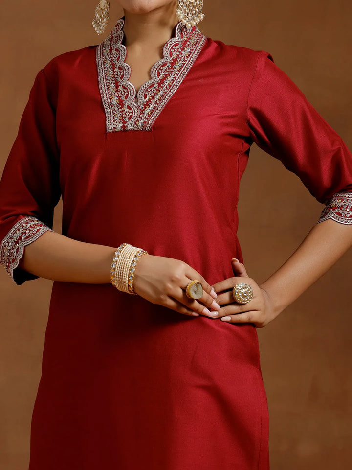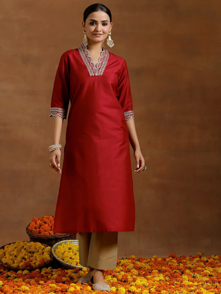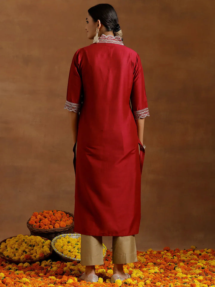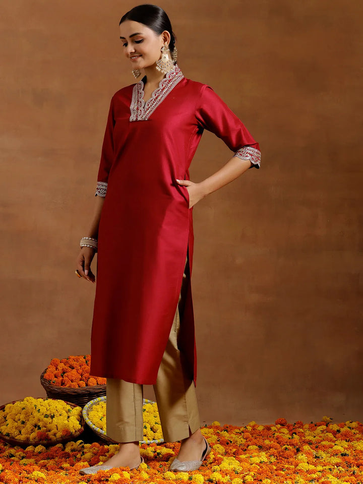Our maroon silk blend straight kurta features a V-neckline and three-quarter sleeves. Highlighted with thread work and sequins, this style is perfect for festive celebrations.