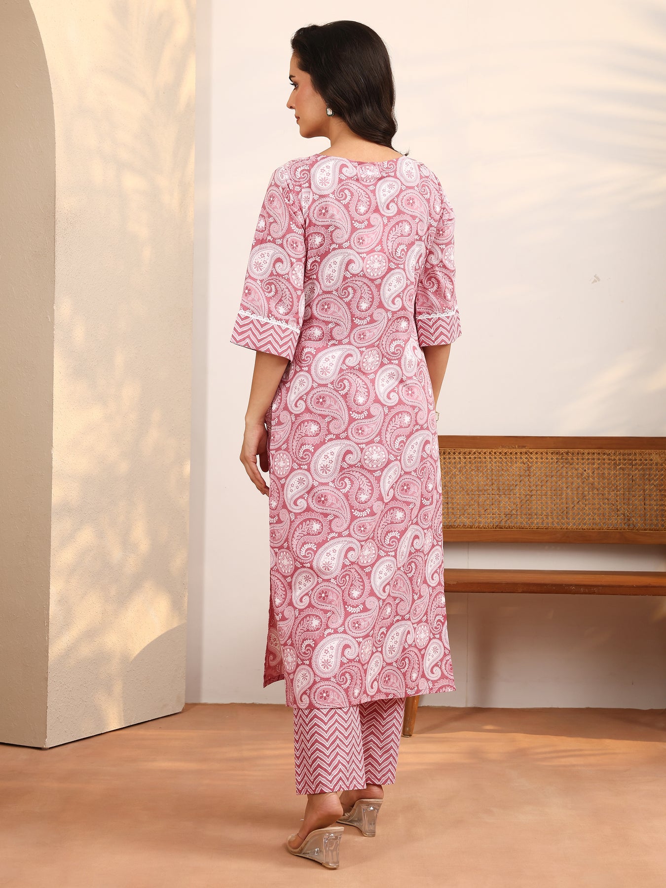 Our 2-piece Mauve Cotton Straight-Fit Kurta Set features a V-Neckline, Regular Sleeves, and statement yoke. Complemented with Straight Pants with a Partially Elasticated waistband. Adorned with Paisley printed, this style is perfect for Work Wear and Casual Wear.
