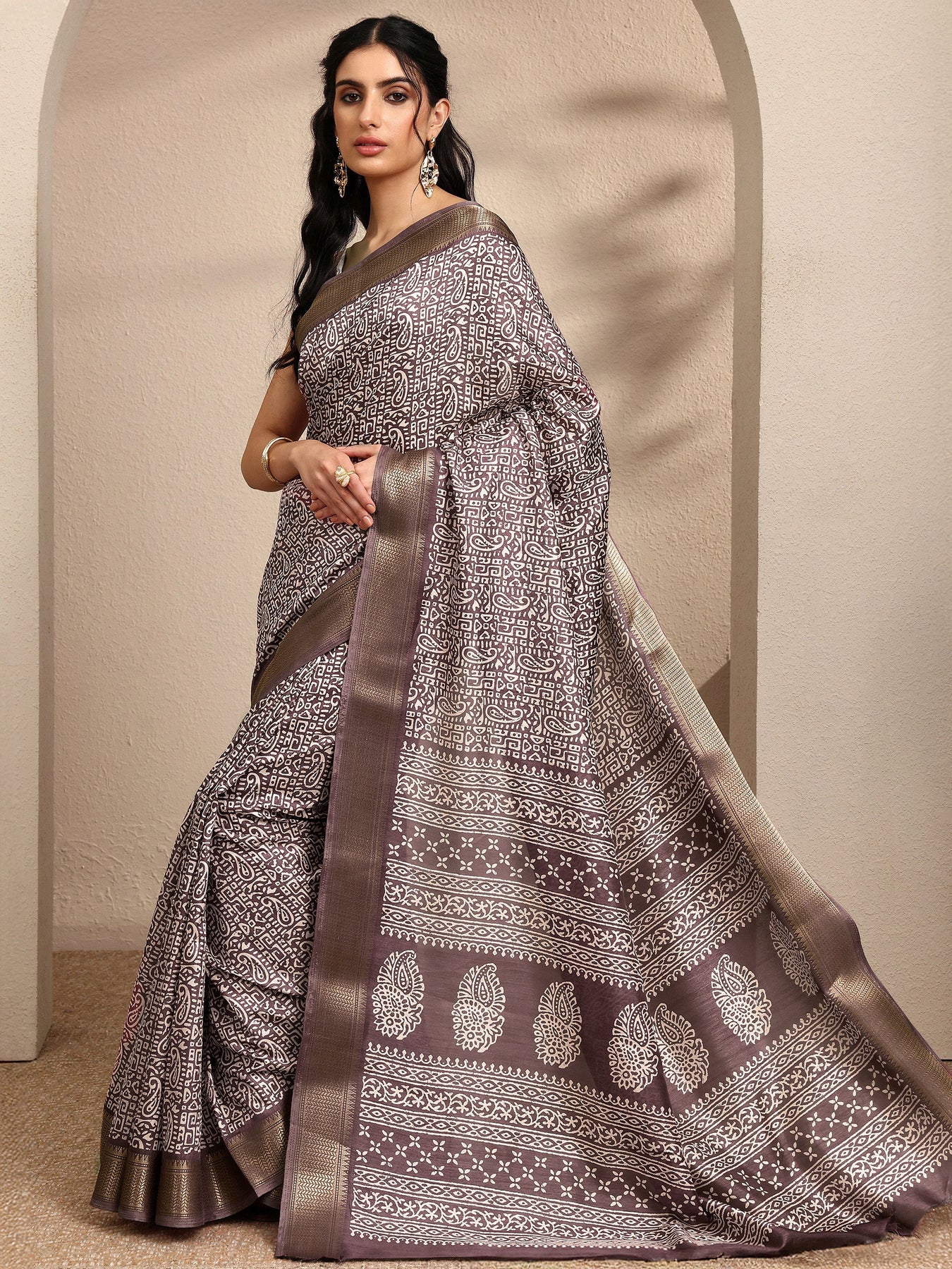 Mauve Paisley Printed Silk Blend Saree With Unstitched Blouse Piece