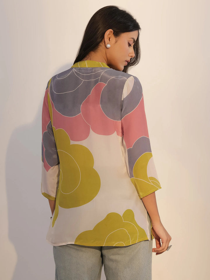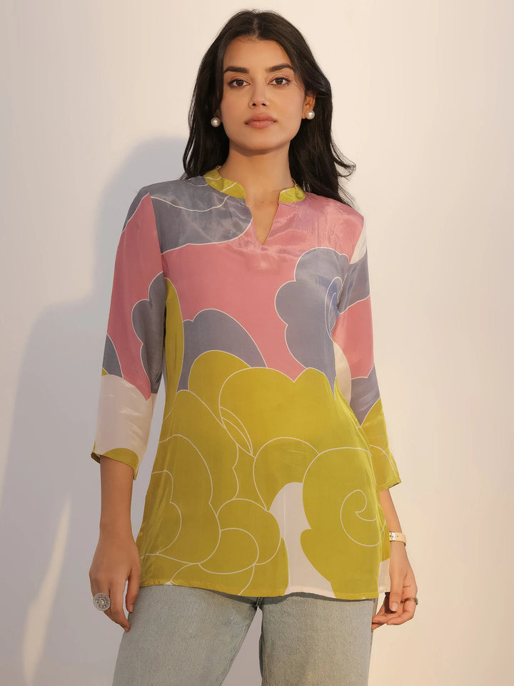 Our multicolour printed silk tunic features a mandarin-notched neckline and three-quarter sleeves. Elevated with abstract prints, this style is ideal for casual outings.