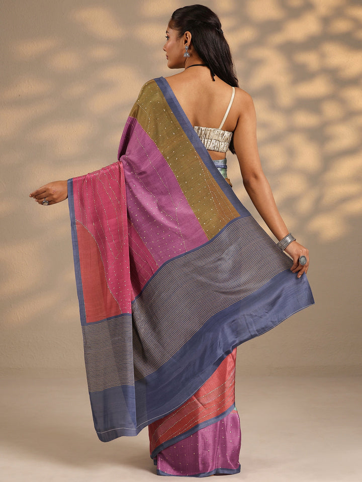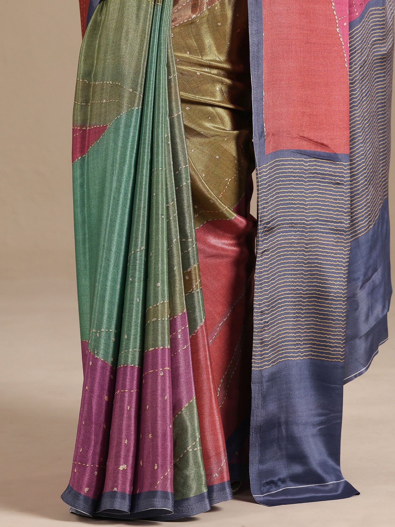 Our Multi Printed Silk Blend Saree Features Captivating Geometric Print. Complemented With A Blouse Piece. This Charming Saree Is Perfect For Festive Occasions.