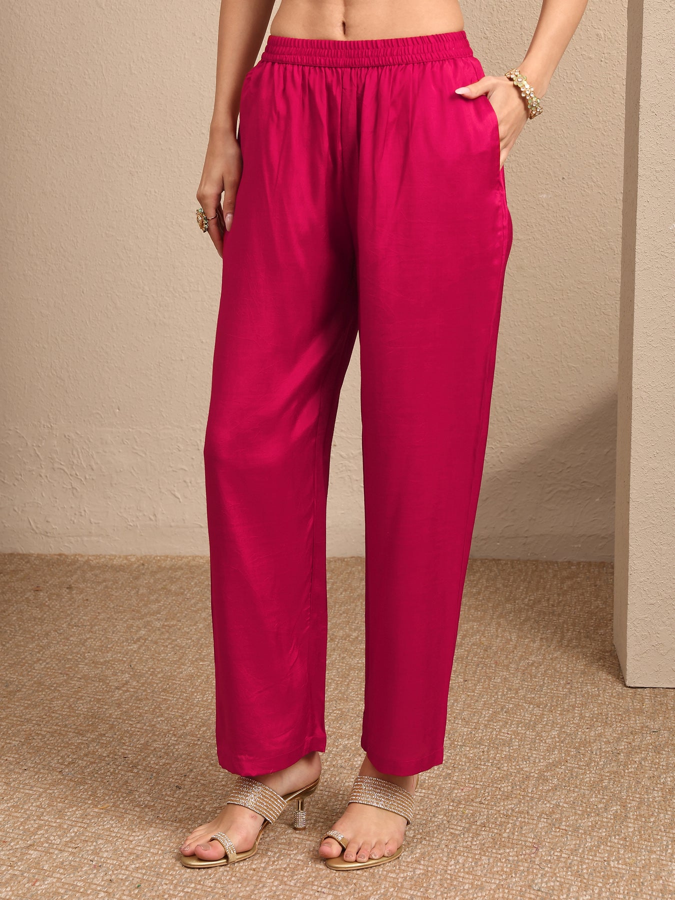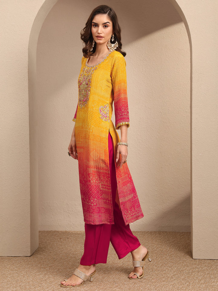 Our 3-piece Yellow and Pink Silk blend Kurta Set features a Straight-fit kurta with a Round Neckline, Regular Sleeves, and statement yoke. Complemented with Straight Pants with a Partially Elasticated waistband and an Embroidered dupatta. Adorned with bandhani printed, this style is perfect for Festive occasions.