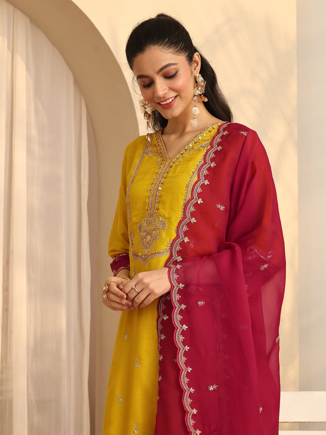 Mustard Embroidered Silk Blend Straight Suit Set With Dupatta