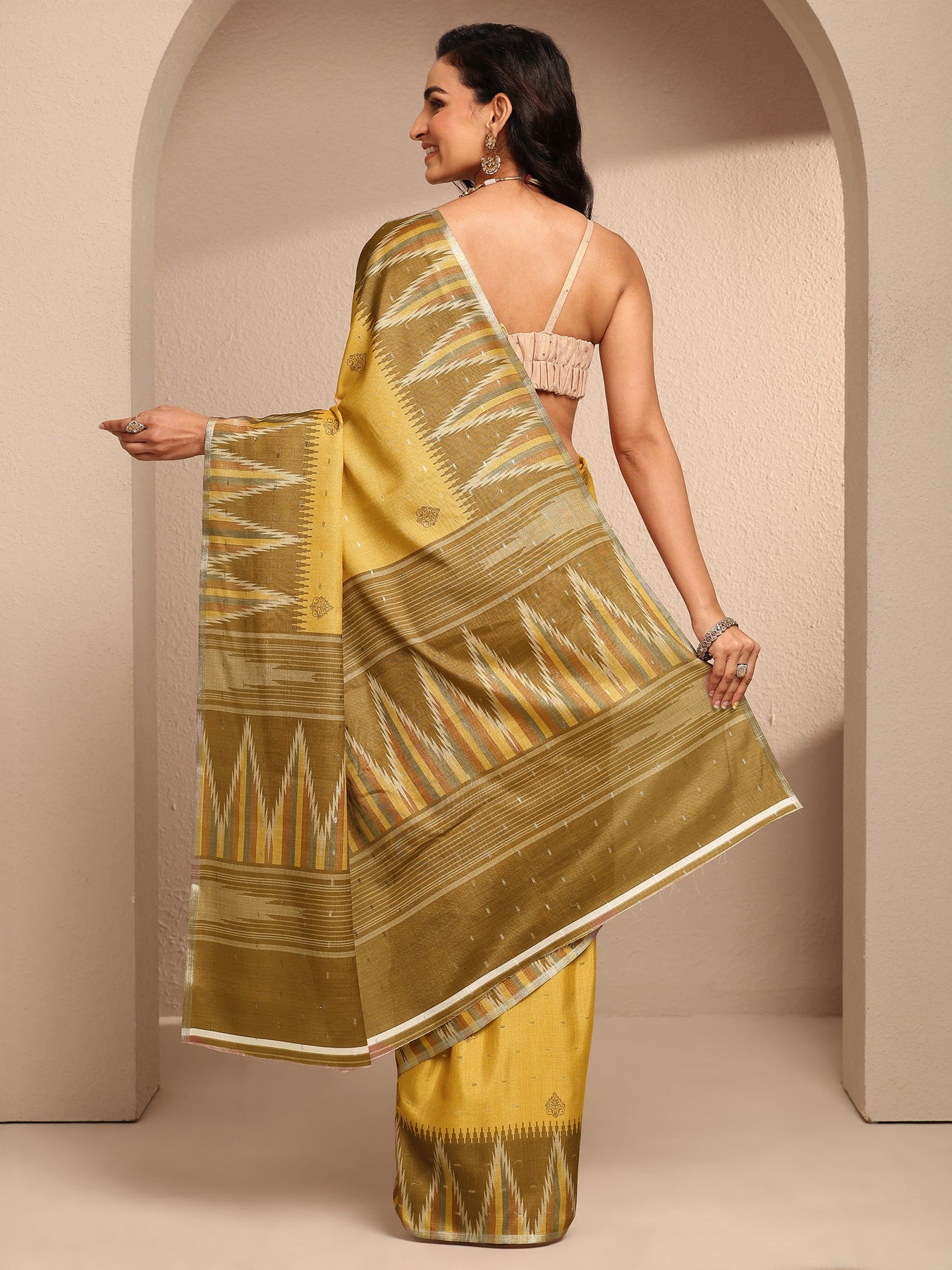 Our mustard printed silk blend saree features captivating geometric print. Complemented with a Unstitched Blousepiece. This charming saree is perfect for festive occasions.