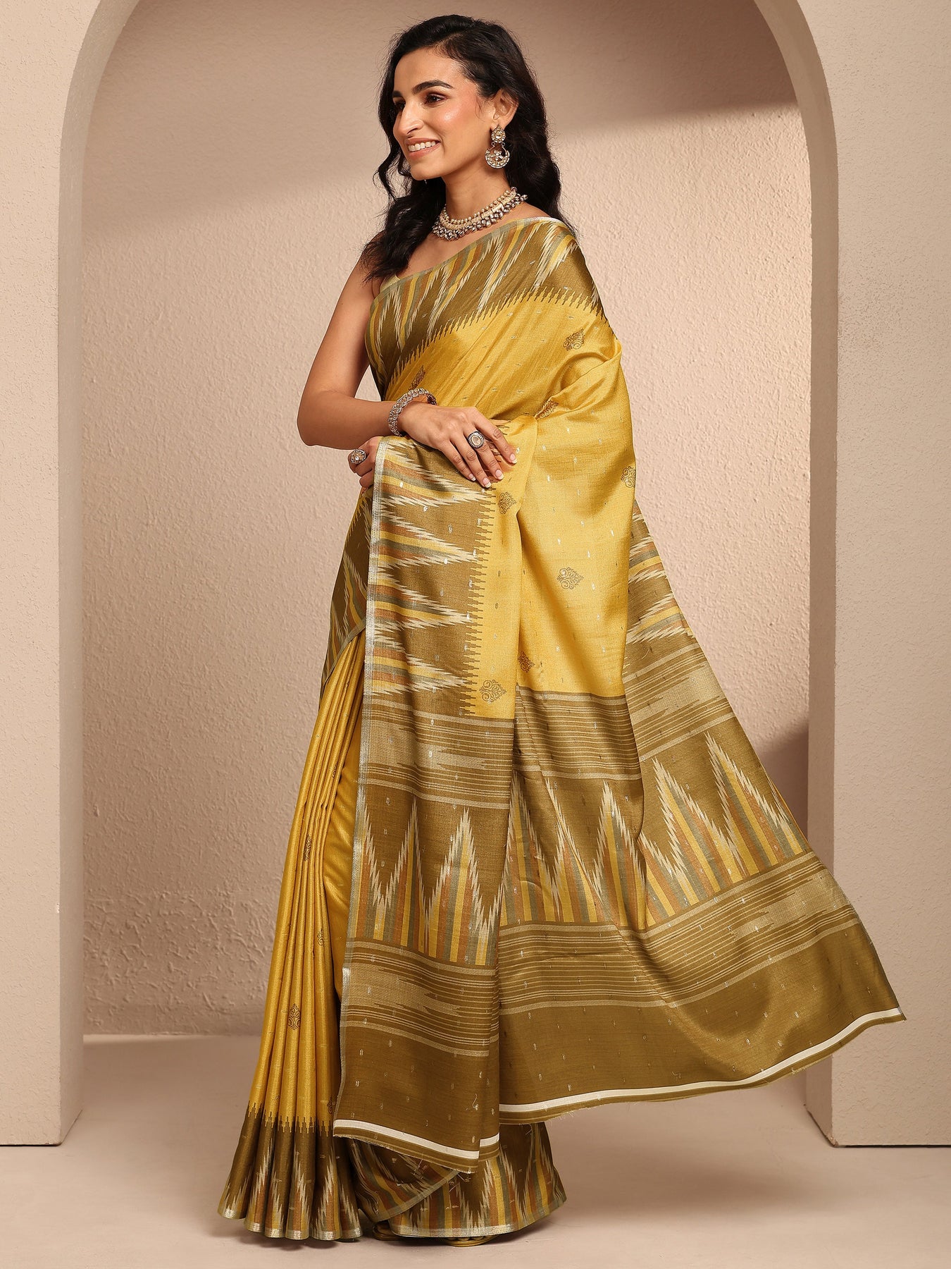 Mustard Ikat Printed Silk Blend Saree With Unstitched Blouse Piece