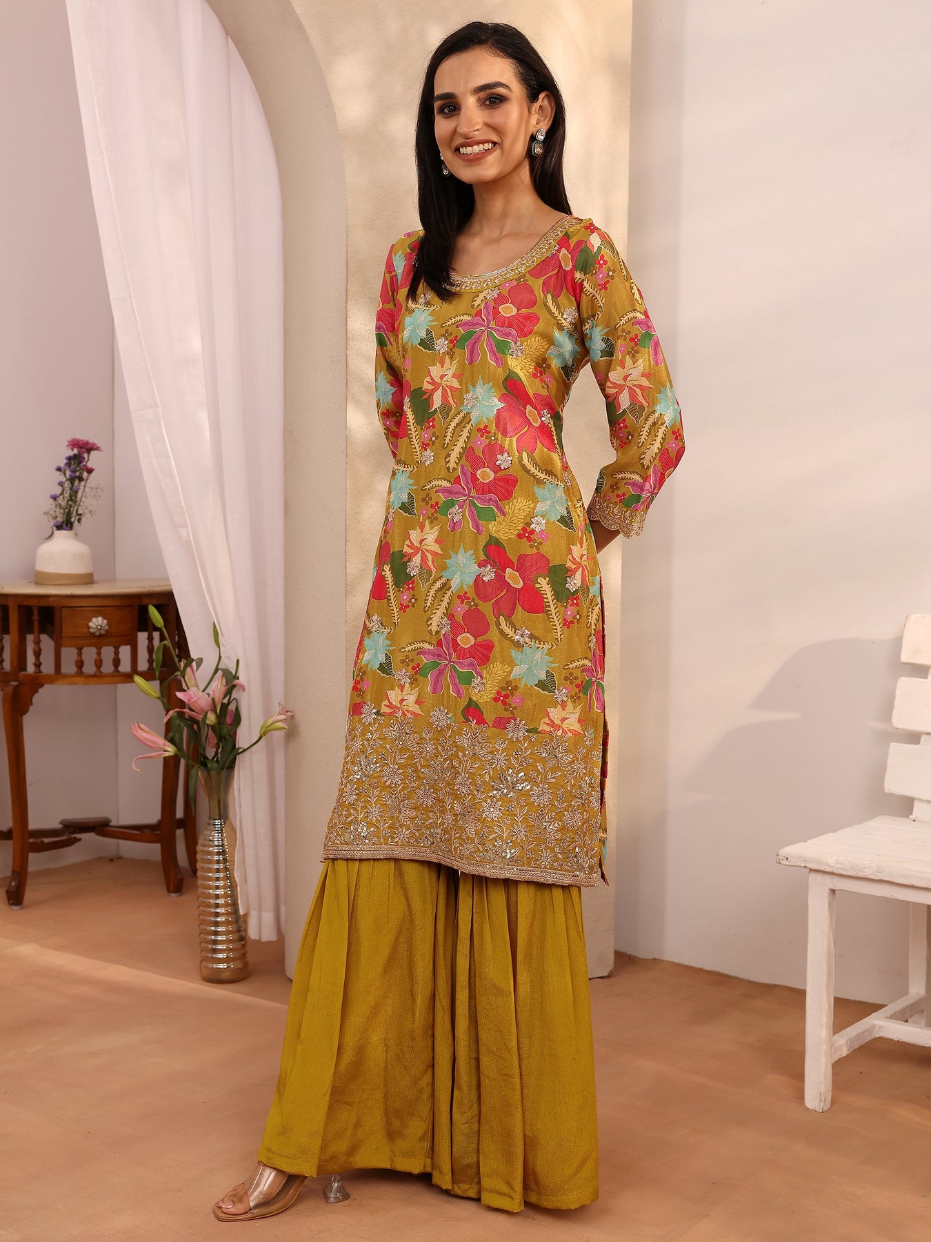 Mustard Printed Chinon Straight Suit Set With Dupatta