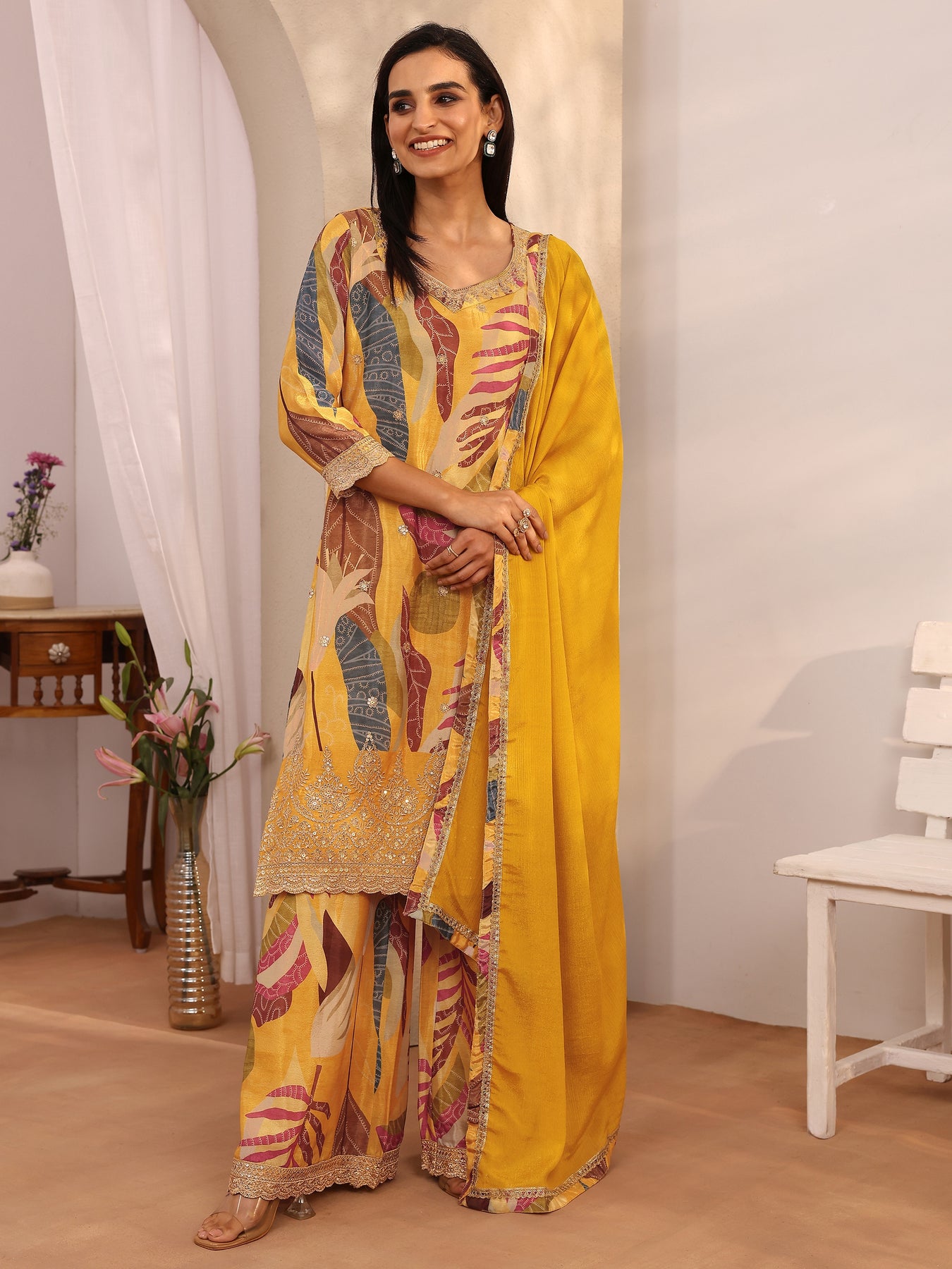 Our 3-piece yellow multi Chinon straight-fit kurta set features a round neckline, regular sleeves, and statement yoke. Complemented with palazzo pants with a partially elasticated waistband and 2 pockets, and a printed dupatta. Adorned with floral printed, this style is perfect for festive occasions.