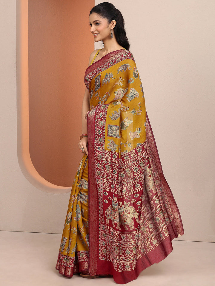 Mustard Printed Silk Blend Saree With Unstitched Blouse Piece