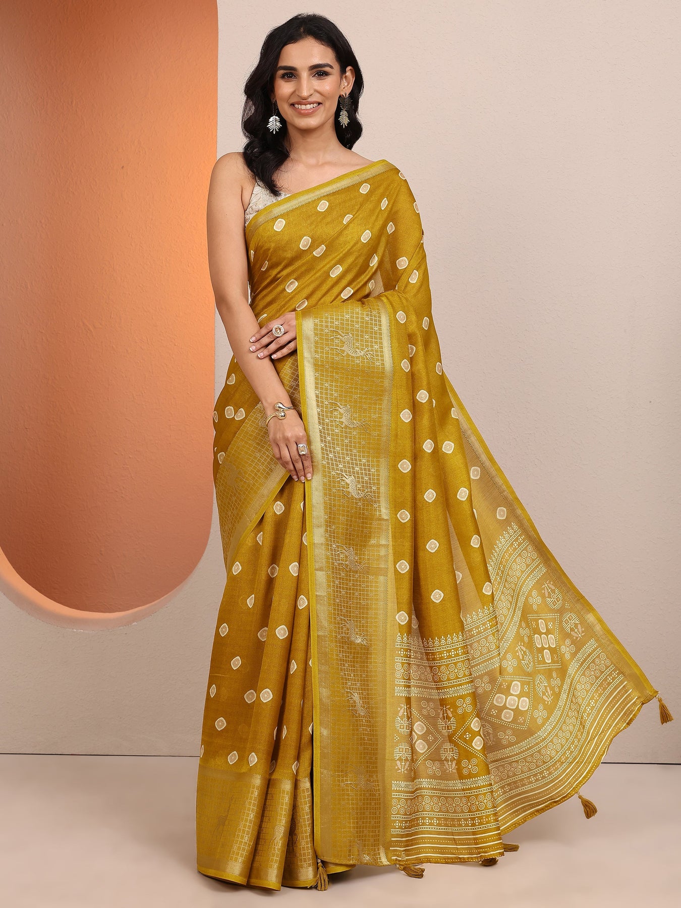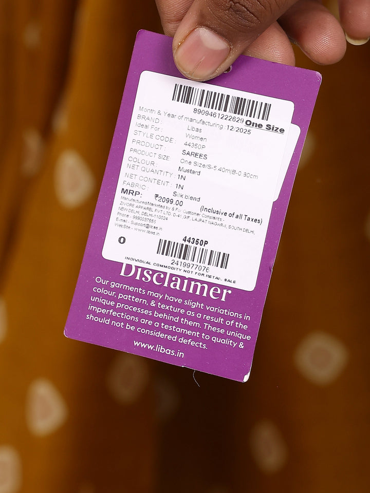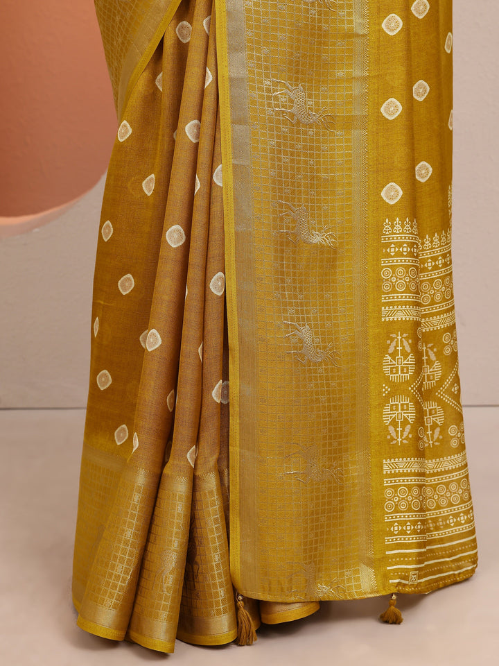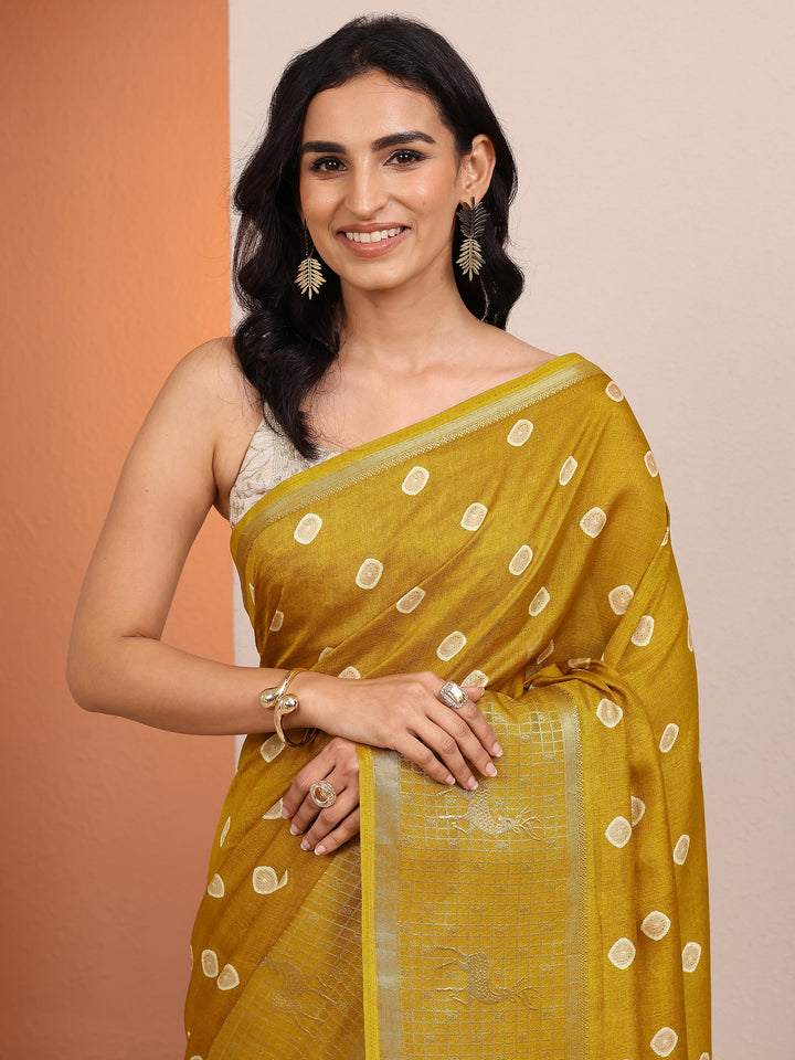 Mustard Printed Silk Blend Saree With Unstitched Blouse Piece