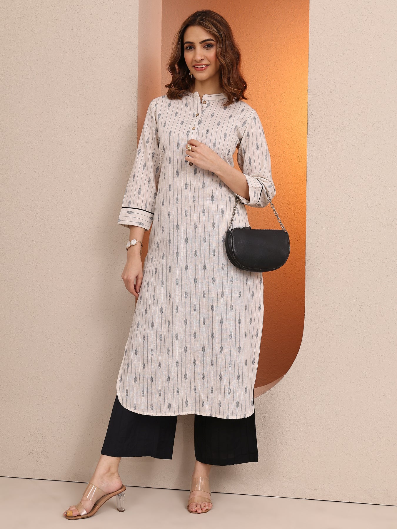 Off White Printed Cotton Blend Straight Kurta