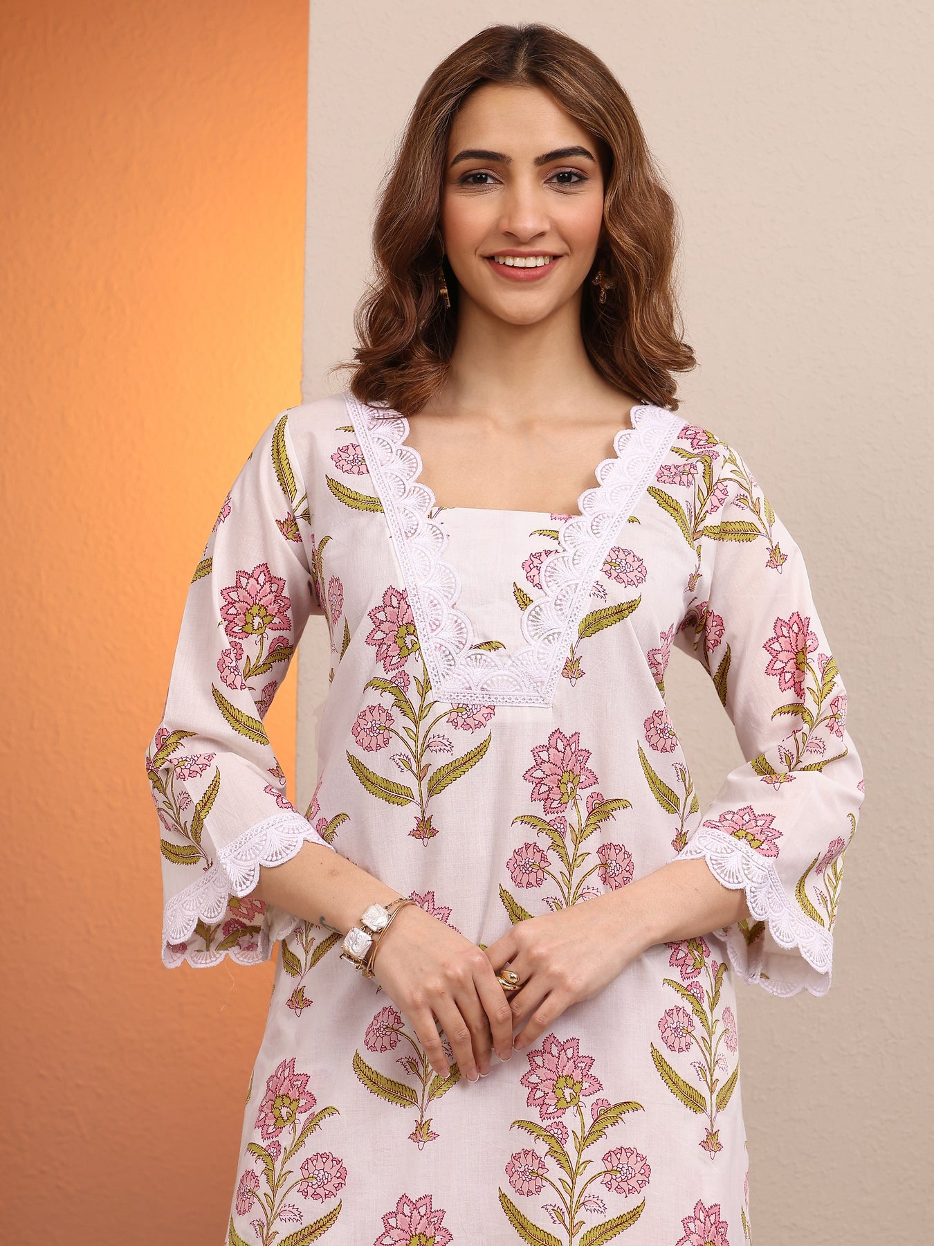 Our 3-piece pink cotton straight-fit kurta set features a V-neckline, bell sleeves, and statement yoke. Complemented with straight pants with a partially elasticated waistband and 2 pockets, and a printed dupatta. Adorned with floral printed, this style is perfect for festive occasions.