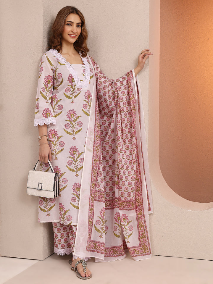 Off White Printed Cotton Straight Suit Set With Dupatta