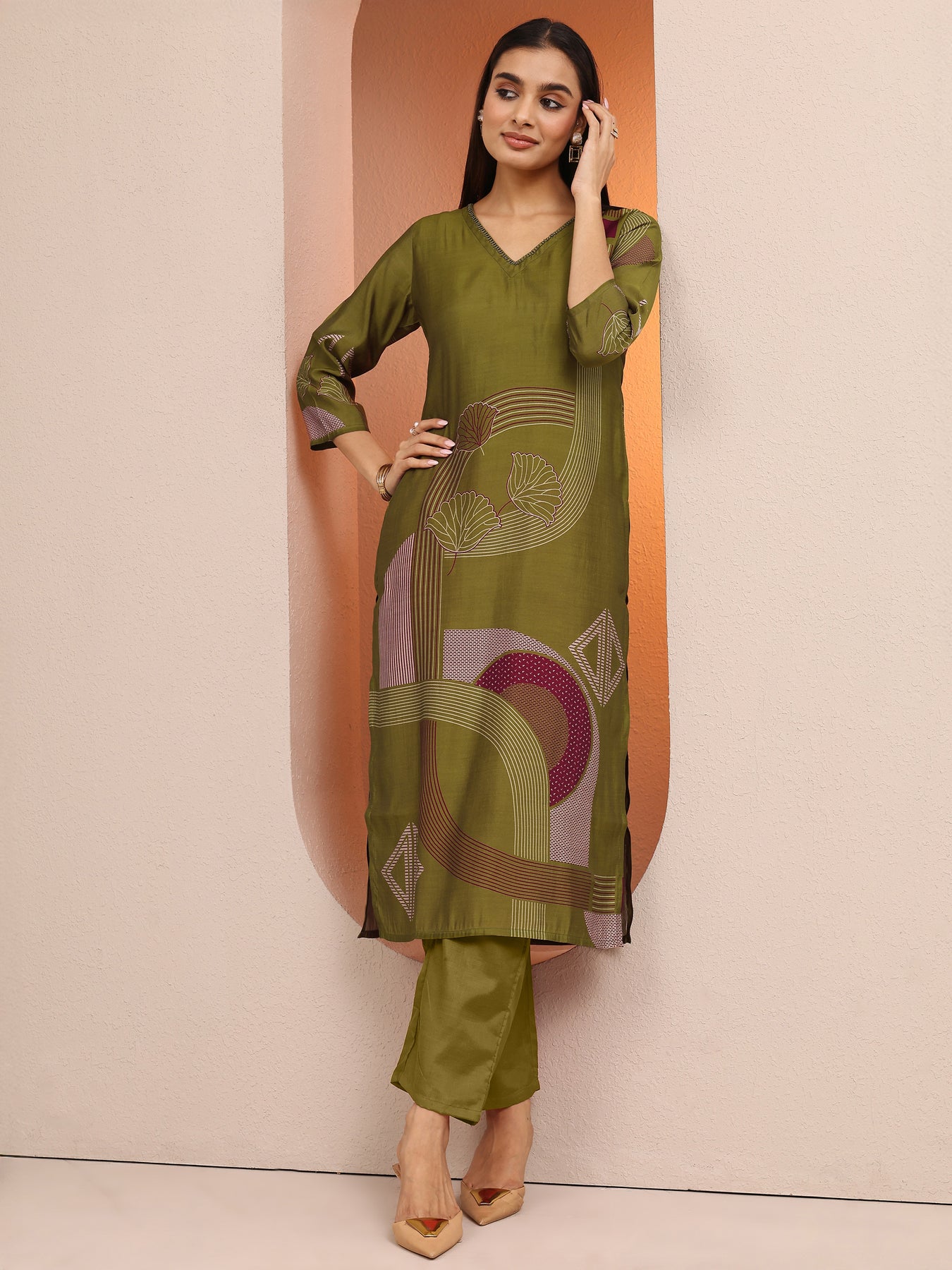 Our 1-piece olive silk blend straight-fit kurta features a V-neckline, regular sleeves, and statement yoke. Adorned with abstract print, this style is perfect for work wear and casual wear.