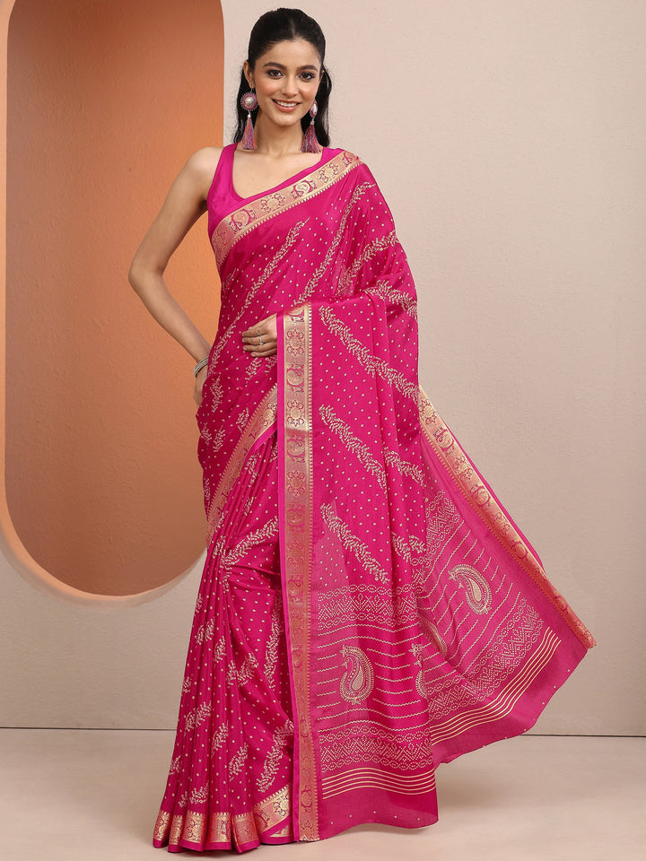 Pink Bandhani Printed Silk Blend Saree With Unstitched Blouse Piece