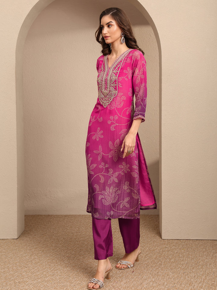 Pink Bandhani Printed Silk blend Straight Suit Set With Dupatta