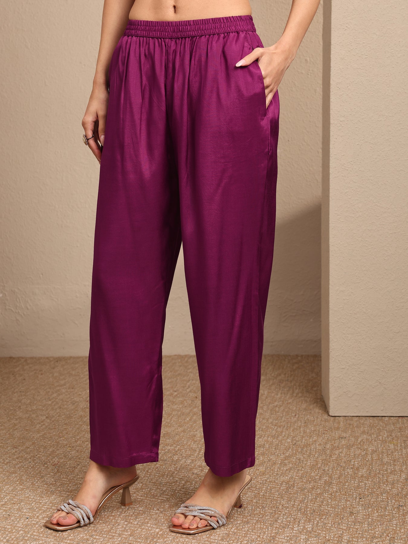 Our 3-piece pink silk blend kurta set features a straight-fit design with a V-neckline, regular sleeves, and statement yoke. Complemented with straight pants with a partially elasticated waistband and an embroidered dupatta. Adorned with bandhani printed, this style is perfect for festive occasions.