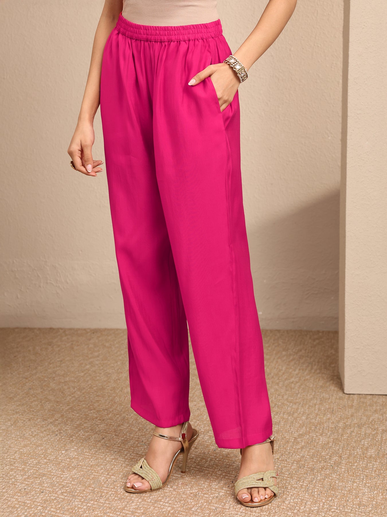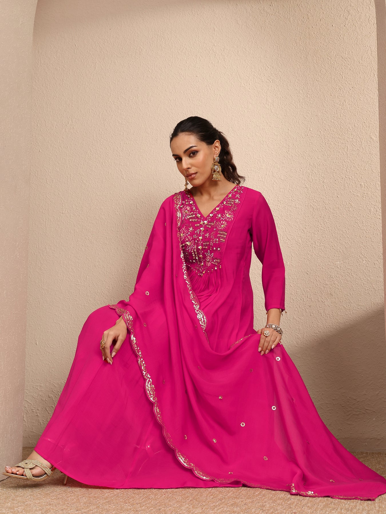 Our 3-piece pink silk blend Anarkali kurta set features a V-neckline, regular sleeves, and a statement yoke. Complemented with straight pants with a partially elasticated waistband and an embroidered dupatta. Adorned with beads embellished, this style is perfect for festive occasions.