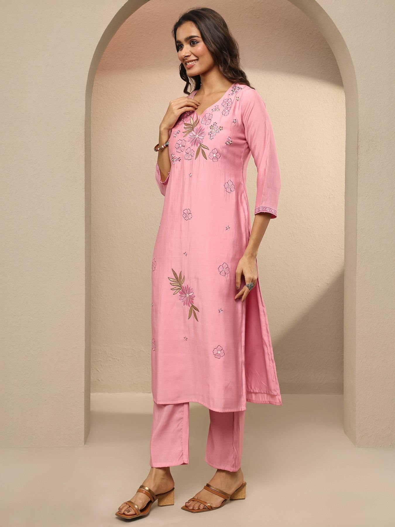 Our 3-piece Pink Silk blend Straight-fit Kurta Set features a V-Neckline, Regular Sleeves, and statement yoke. Complemented with Straight Pants with a Partially Elasticated waistband and 2 pockets, and an Embroidered dupatta. Adorned with floral embroidered, this style is perfect for Festive occasions.