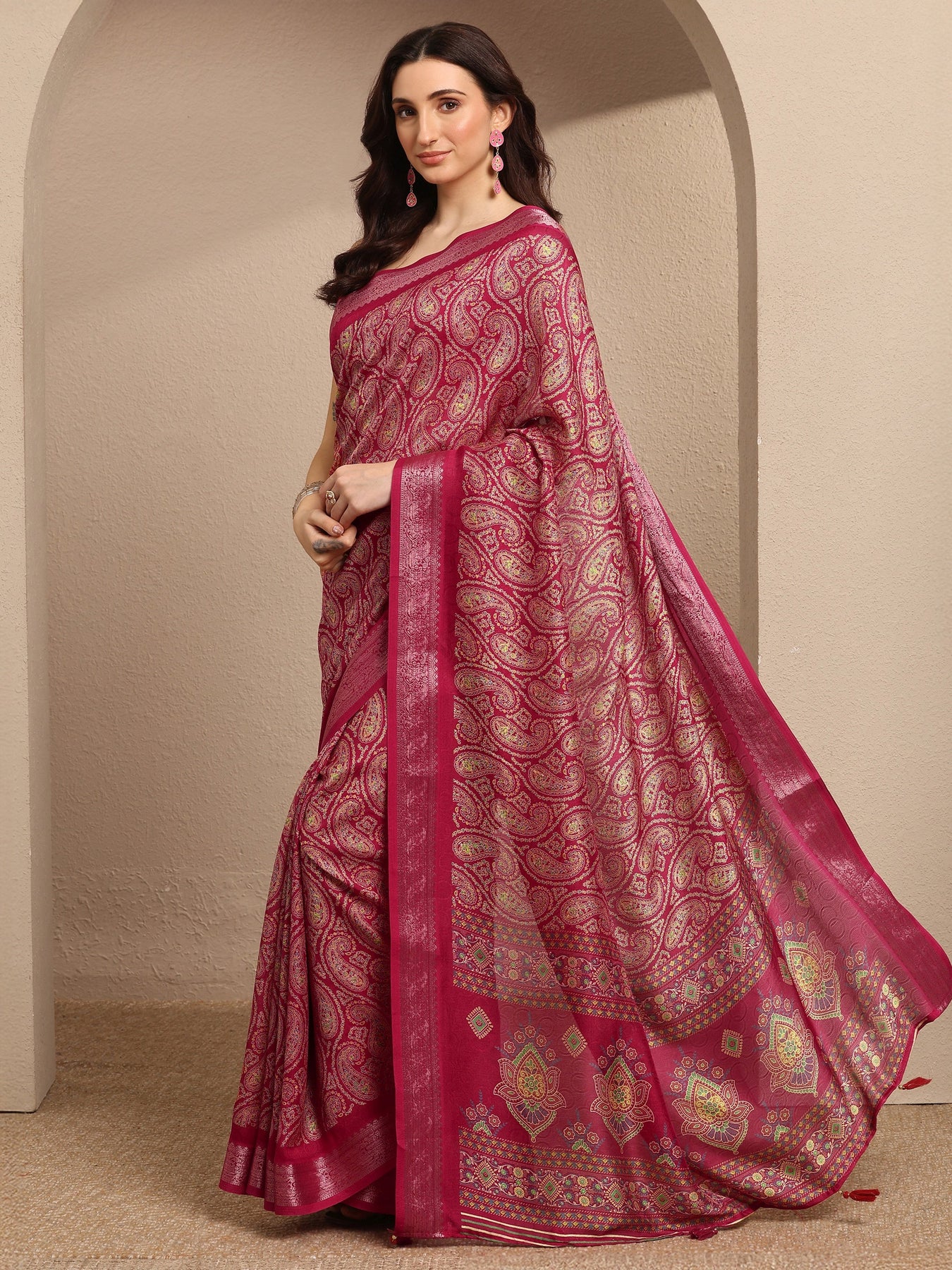 Our Magenta printed Silk blend saree features captivating paisley print. Complemented with a Unstitched blouse piece.. This charming saree is perfect for festive occasions.