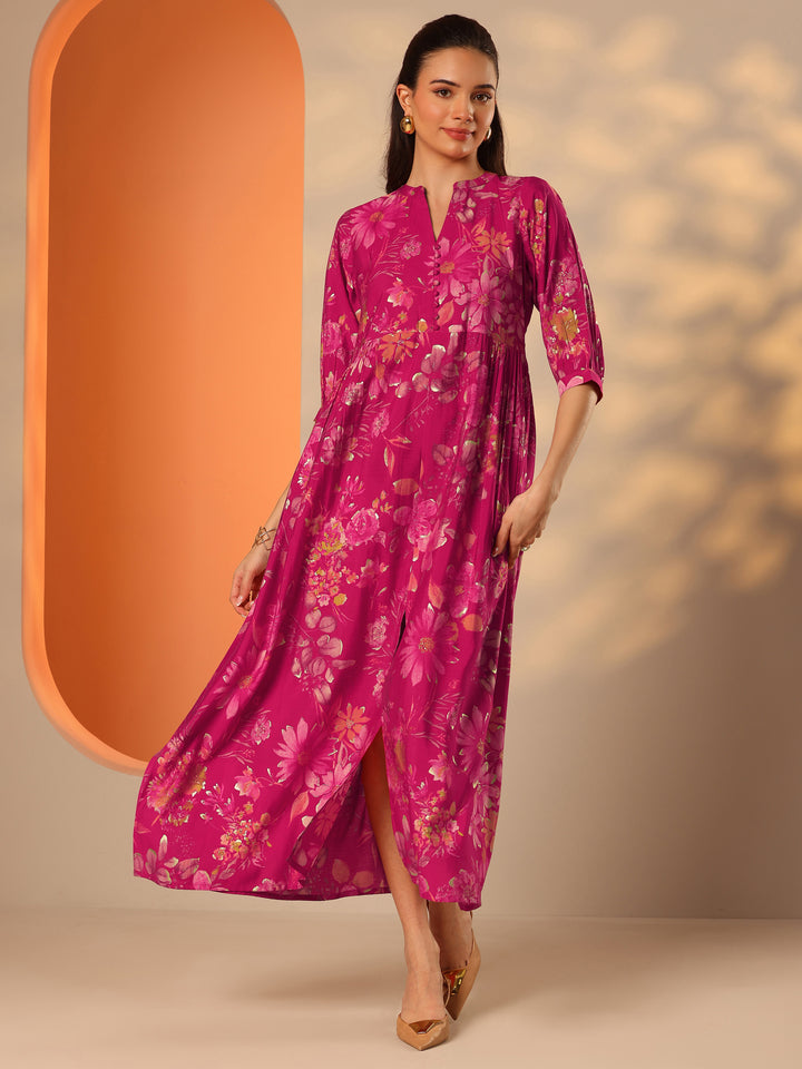 Our pink printed silk blend midi dress features a mandarin collar, three-quarter sleeves, and a flared hemline. Highlighted with captivating floral prints, this style is perfect for casual wear.