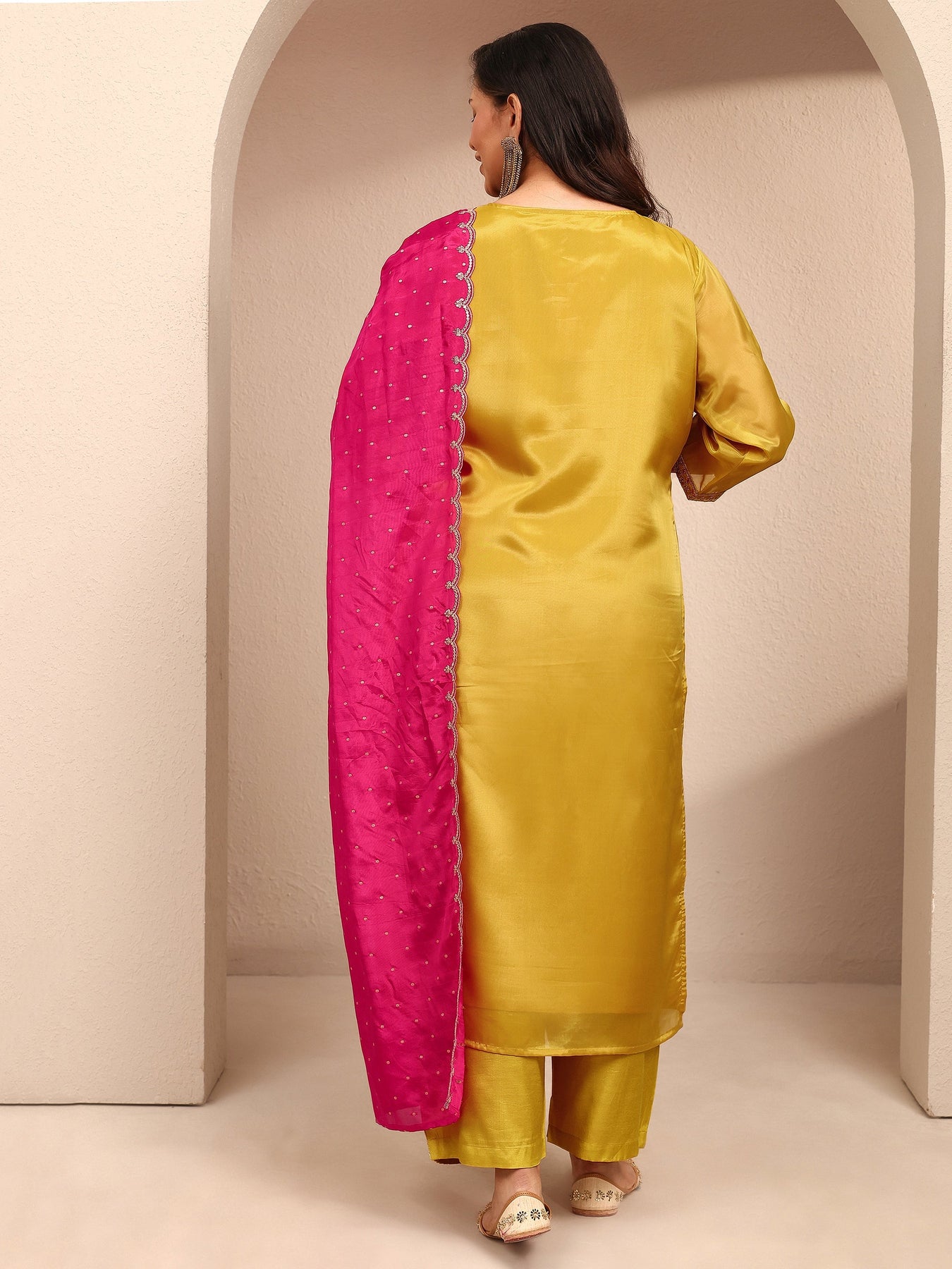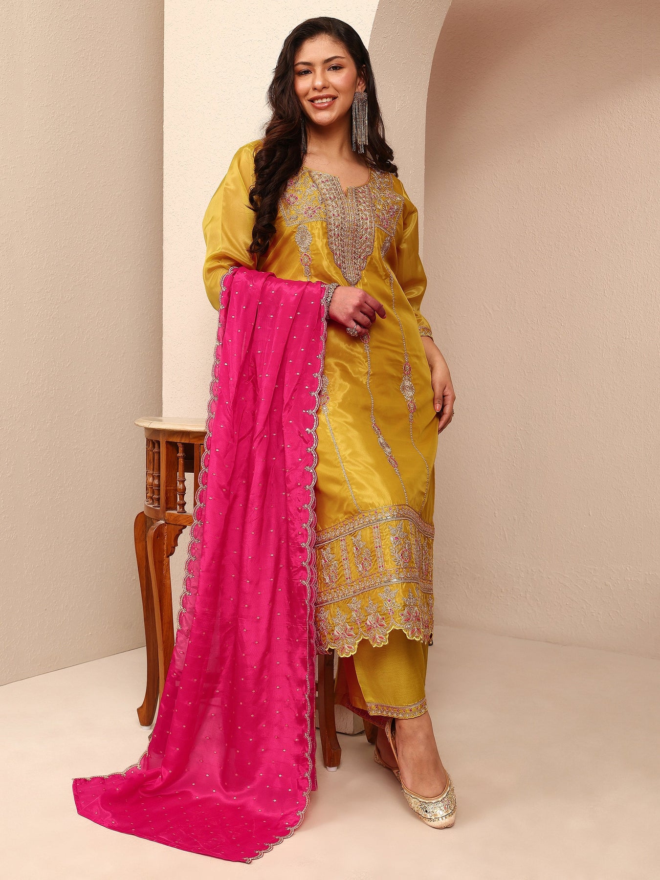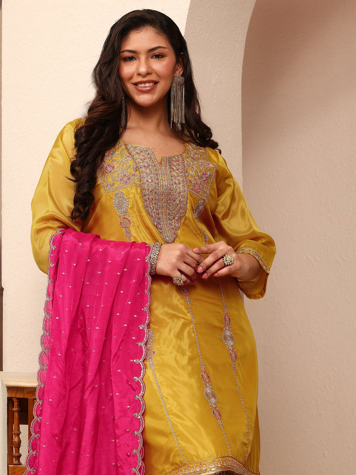 Plus Size Mustard Embroidered Plus Size Clothing Organza Straight Suit Set With Dupatta