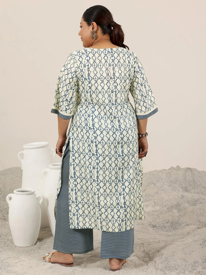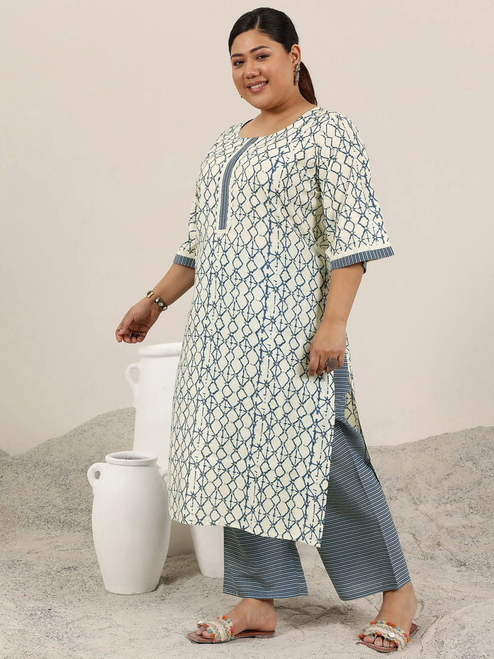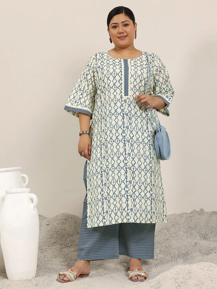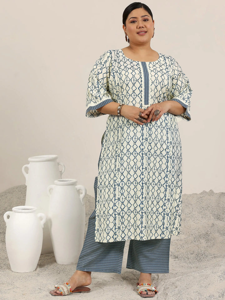 Plus Size Off White Printed Silk Blend Straight Kurta Set