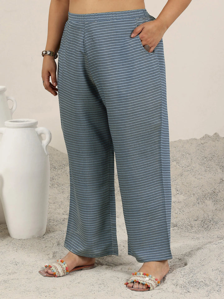 Libas Extra Love collection features our signature designs in comfortable plus sizes. Our signature designs in comfortable plus sizes. Libas Extra Love collection features our signature designs in comfortable plus sizes. Our 2-piece off white printed silk blend straight suit set features a straight-fit kurta with a round neckline and three-quarter sleeves. Complemented with matching trousers with a partially elasticated waistband and roomy pockets. Adorned with geometric prints, fabric-trim accents and charming sequins, this style is ideal for casual outings.