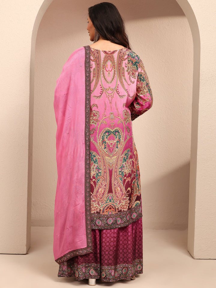 Our 3-piece pink and maroon crepe straight-fit kurta set features a round neckline, regular sleeves, and statement yoke. Complemented with lining and sharara pants with a partially elasticated waistband, and a solid dupatta. Adorned with embellished, this style is perfect for dark festive occasions.