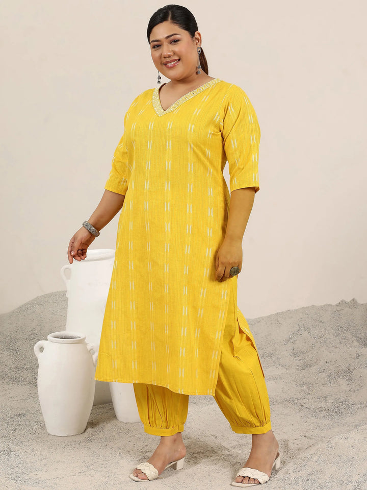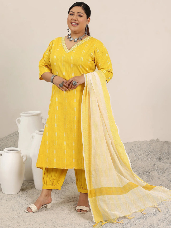 Libas Extra Love collection features our signature designs in comfortable plus sizes. Our 3-piece yellow woven design cotton blend straight suit set features a kurta with a V-neckline and three-quarter sleeves. Complemented with Salwar trousers with a partially elasticated waistband and roomy pockets, and a dupatta. Highlighted with striped woven design and mirror accents, this style is perfect for casual outings.