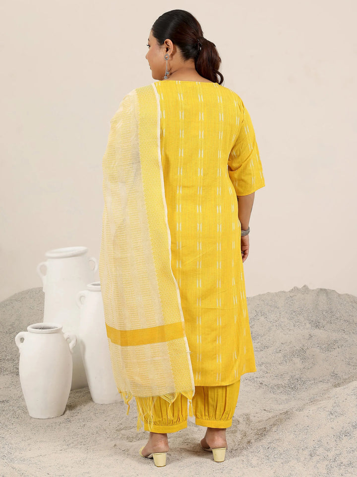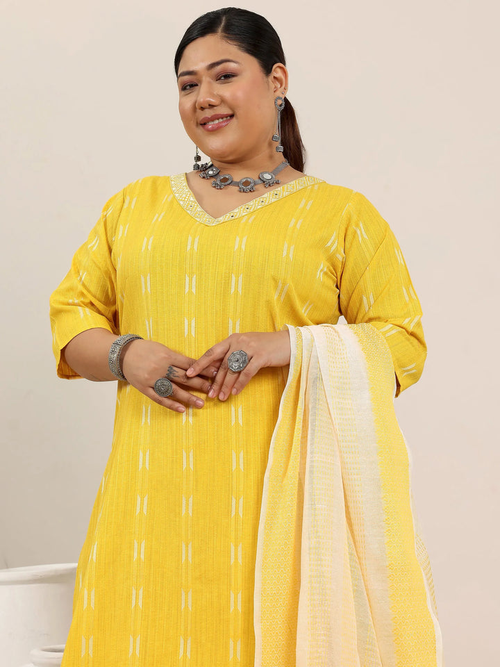 Plus Size Yellow Woven Design Cotton Blend Straight Suit Set With Dupatta