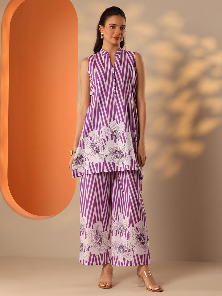 Our 2-piece Purple printed Cotton co-ord set features a Straight-fit Tunic with a Mandarin Collar neckline and Sleeveless design. Complemented with matching Palazzos with a partially elasticated waistband. Highlighted with Floral Printed embellishments, this style is perfect for Casual wear.