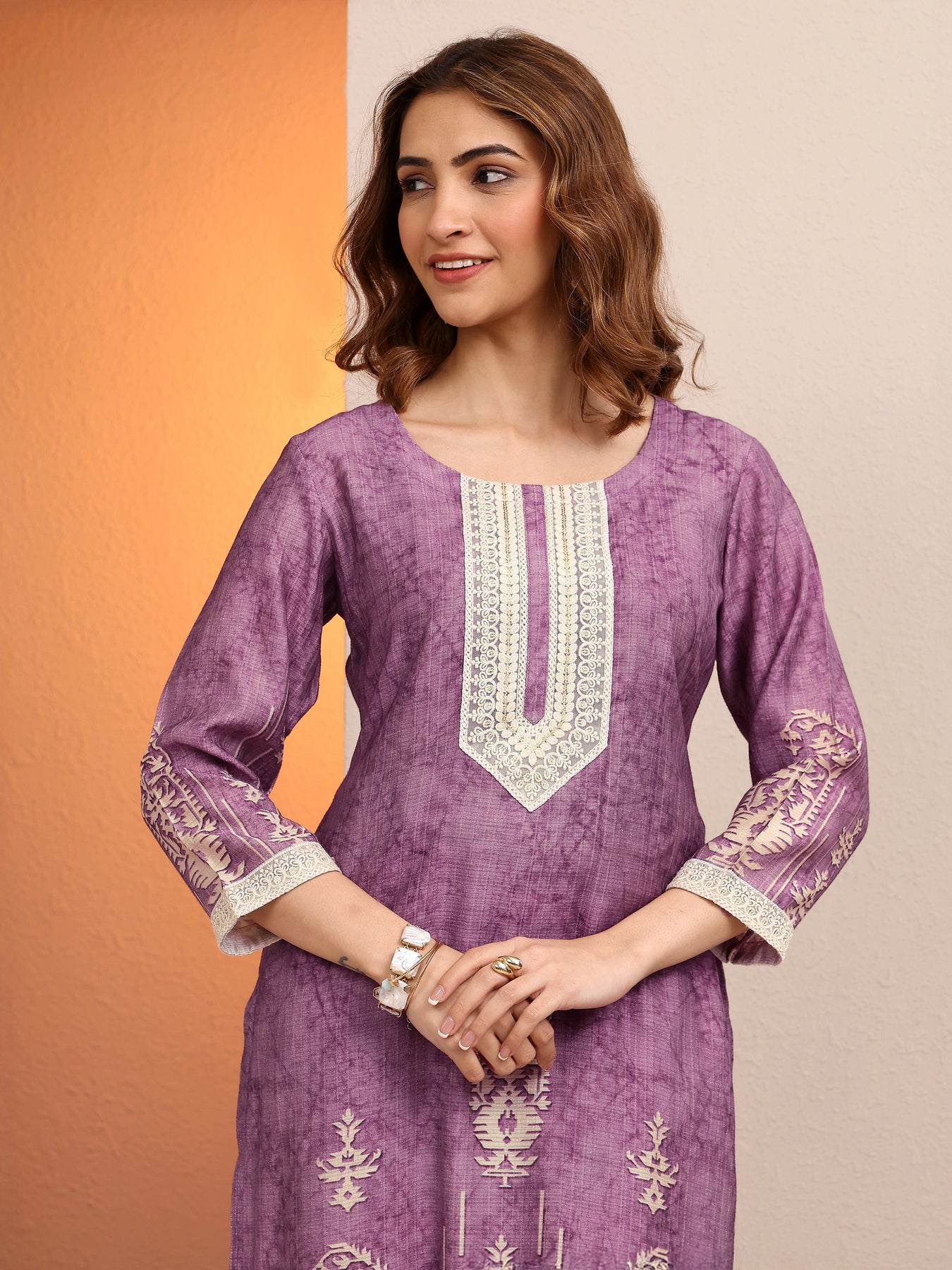 Our 3-piece purple silk blend straight-fit kurta set features a round neckline, regular sleeves, and statement yoke. Complemented with straight pants with a partially elasticated waistband and 2 pockets, and an embroidered dupatta. Adorned with ethnic motif printed, this style is perfect for festive occasions.