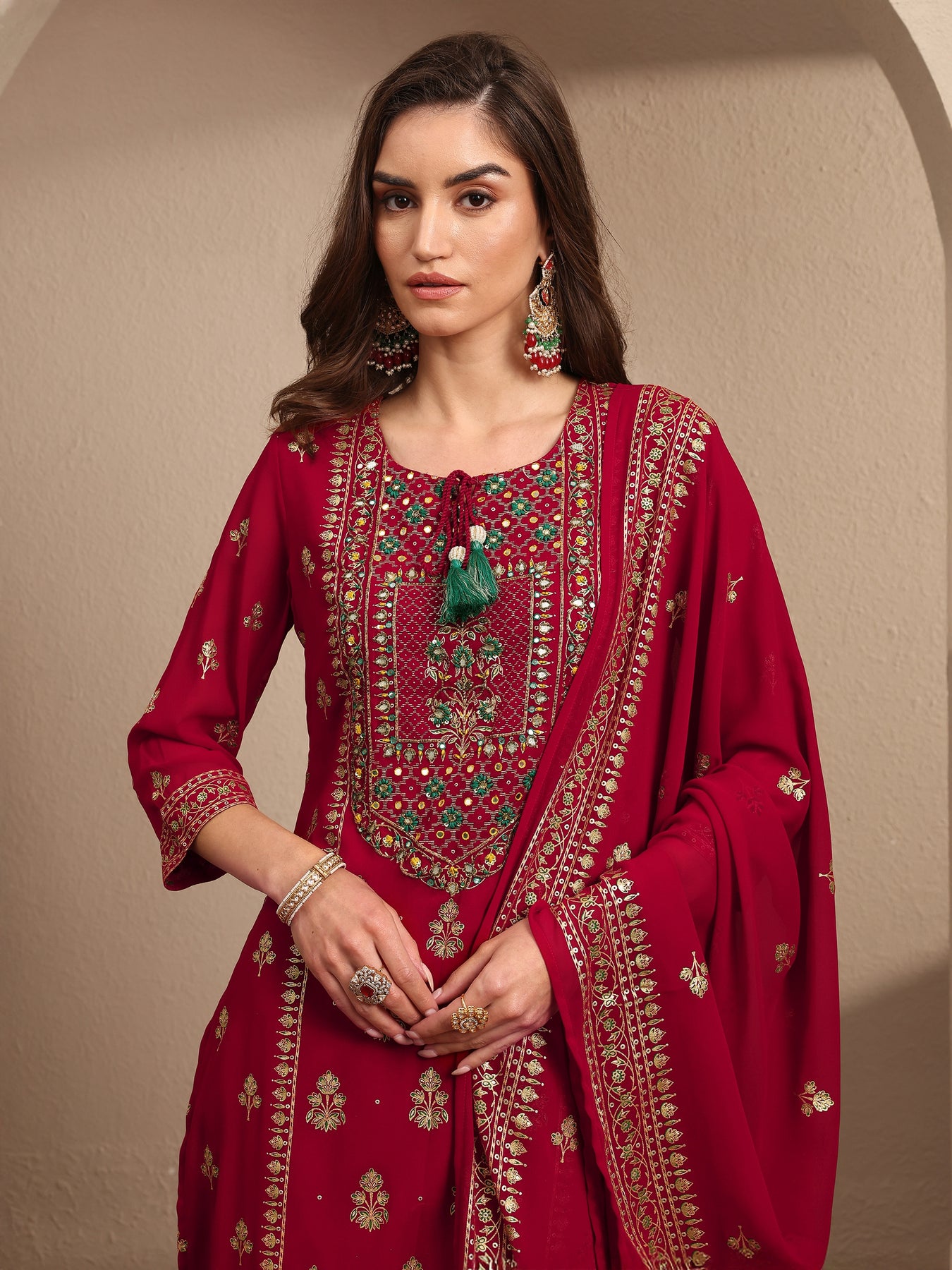 Our 3-piece Red Georgette Kurta Set features a Straight-fit kurta with a Round Neckline, Regular Sleeves, and statement yoke. Complemented with Palazzo Pants with a Partially Elasticated waistband and 2 pockets, and an Embroidered dupatta. Adorned with floral printed and embroidered, this style is perfect for Dark Festive.