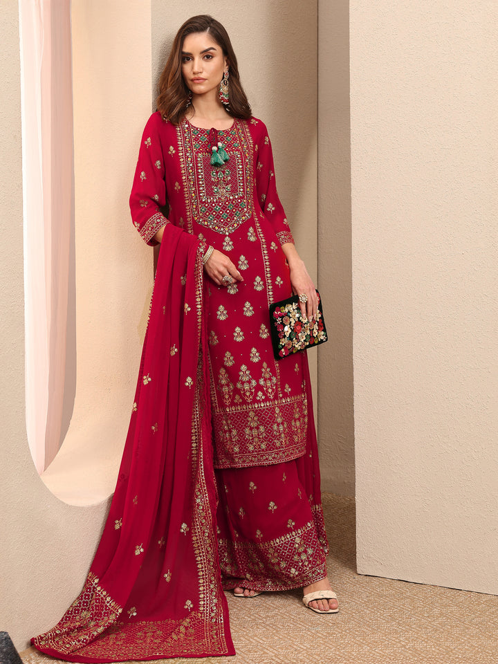 Red Embroidered Georgette Straight Suit Set With Dupatta