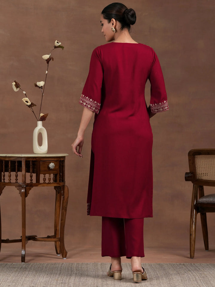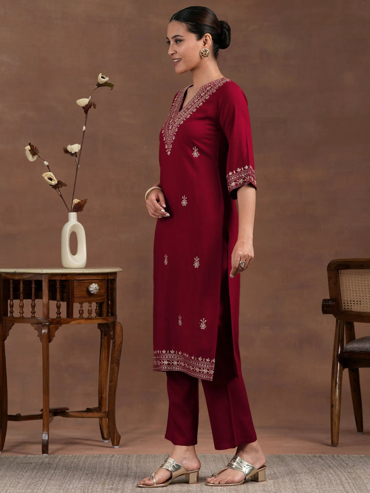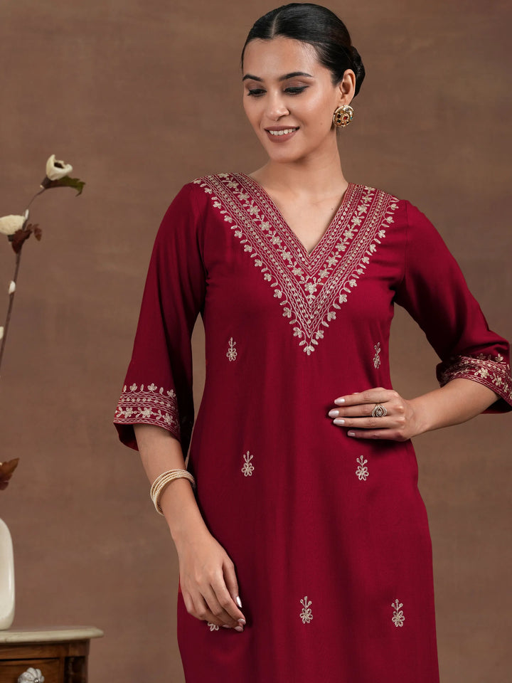 Red Embroidered Rayon Straight Kurta Set