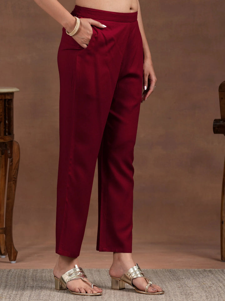 Our 2-piece red embroidered viscose rayon kurta set, features a straight-fit kurta with a V-neckline, three-quarter sleeves, and a statement yoke. Complemented with trousers with a partially elasticated waistband and roomy pockets. Highlighted with floral embroidery, this style is perfect for work and beyond.
