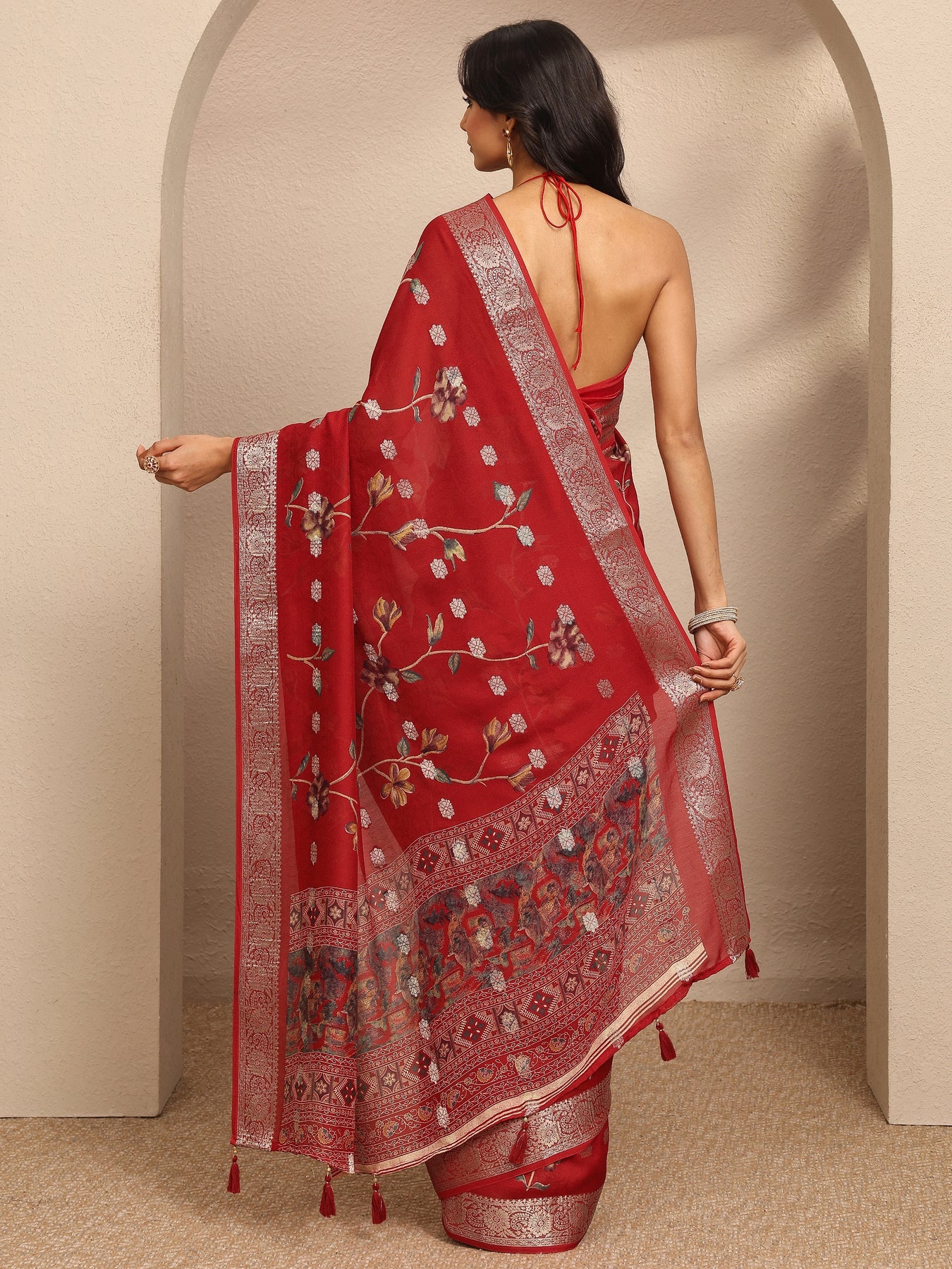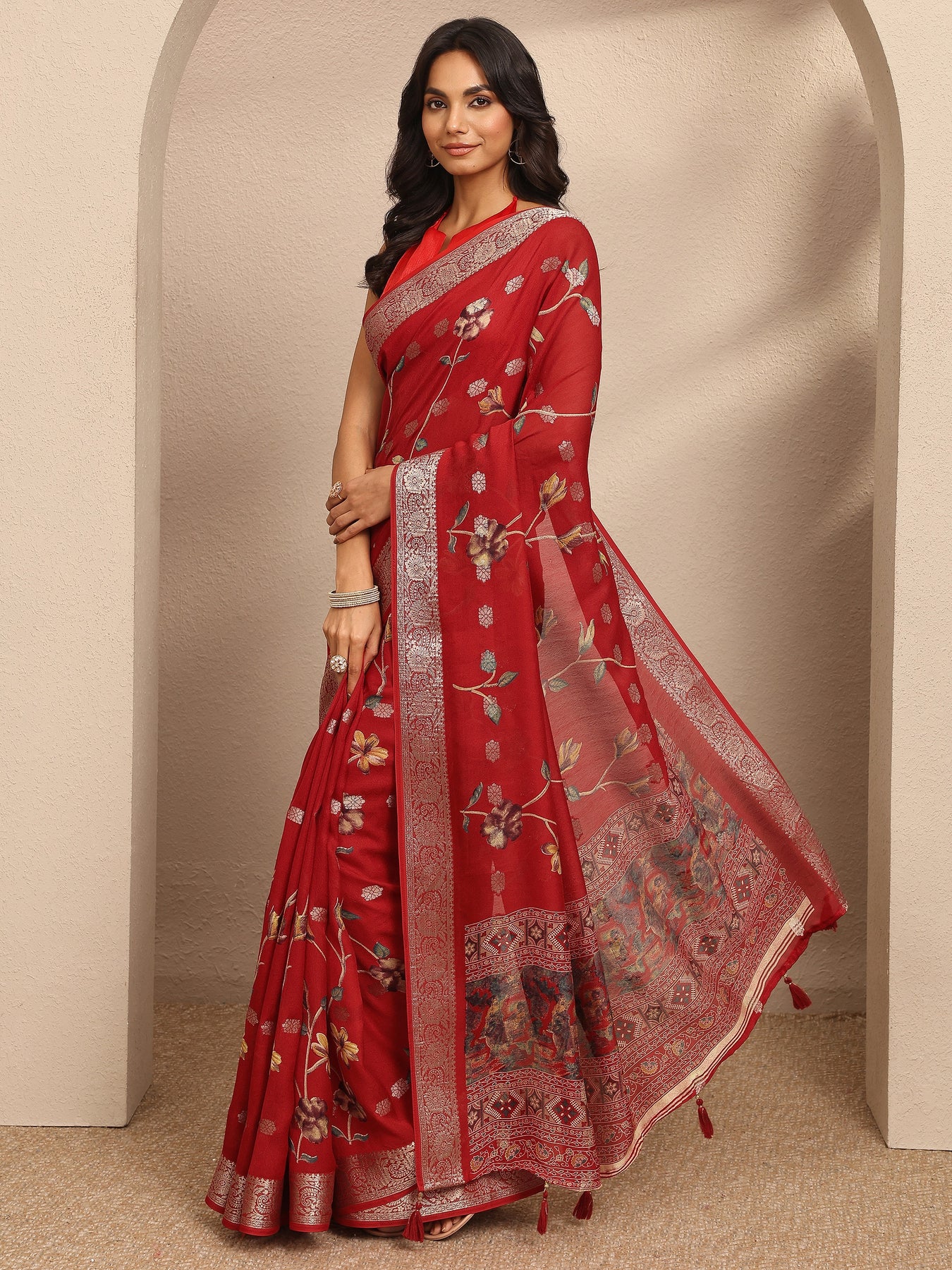 Our Red printed Georgette saree features captivating floral print. Complemented with a Unstitched blouse piece.. This charming saree is perfect for festive occasions.